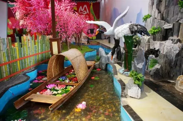 鶴州鹿苑的造景重點(diǎn)突出環(huán)境的清幽和淡雅,楚河的輕舟邊,幽荷浮動,平添雅致,仙鶴及麋鹿又為整幅畫面增添了幾分靈動和活潑。