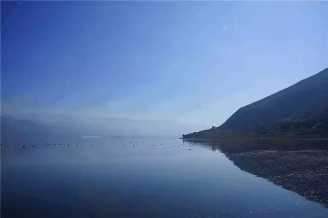 程海水,綠如茵,明如鏡。若遇風(fēng)起,波濤洶涌,如無數(shù)蛟龍圖騰翻舞,浪花飛濺,濤聲轟鳴,似大型樂團在這里奏起交響樂曲。浪擊沿岸,涮得沙石白凈凈,舔得礫巖光生生,形成一條白色的綢帶圍繞海邊。天氣晴朗,風(fēng)平浪靜,程海猶如一塊銀邊鑲嵌的藍色寶鏡平置于青山綠樹之中。秋高氣爽,大雁南飛,長頸鷺絲,黃白野鴨,海鷗白鶴,成群結(jié)隊飛來程海,或在水中嬉戲,或在岸邊覓食,頑童一擊船邦,驚飛一片海鳥,鳴叼聲,擊水聲交織在一起,沖破寧靜的海面。銀燕穿梭,時而翻飛,時而點水,在平靜的水面上留下一個個漣漪。
