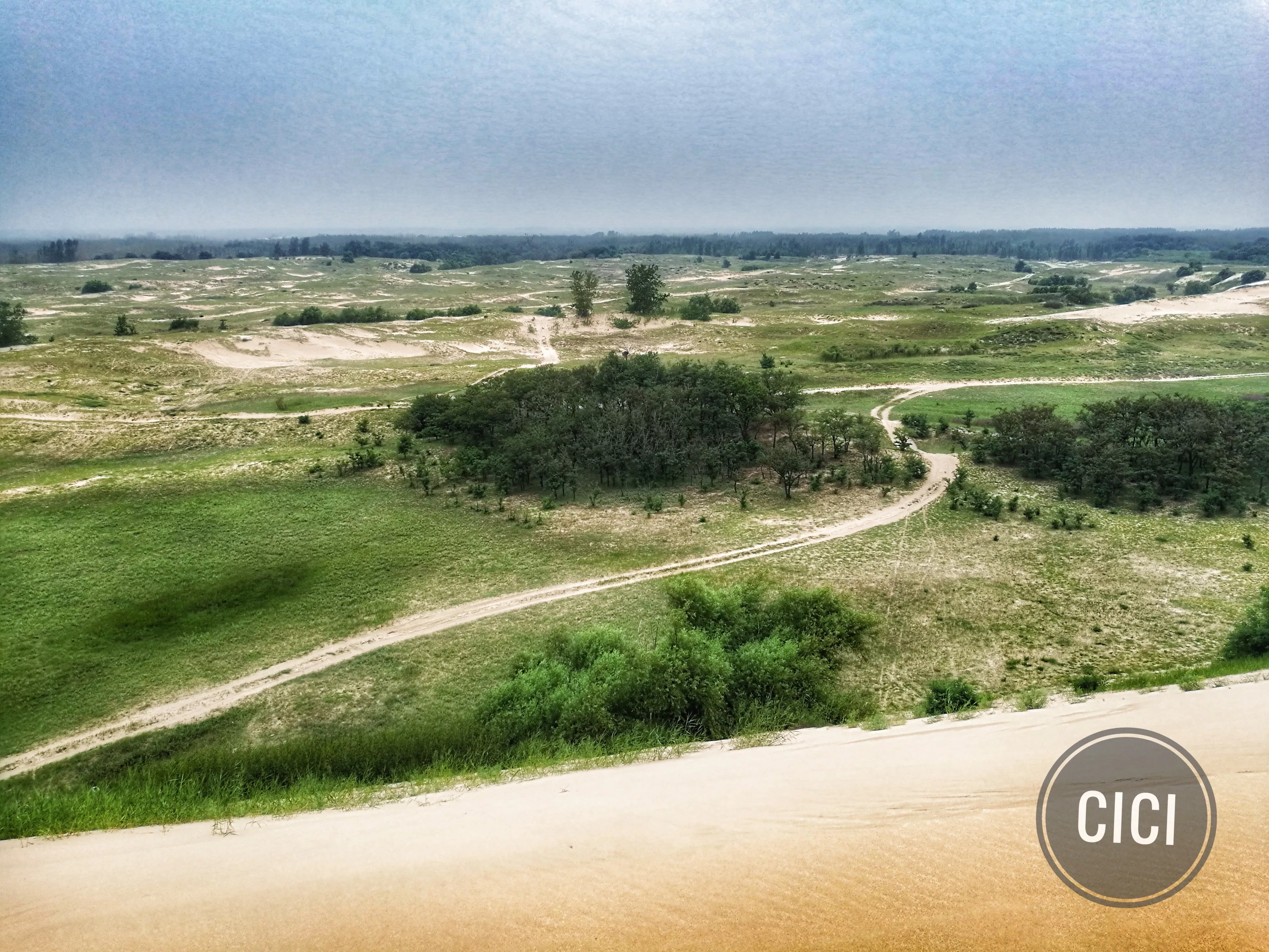 真的是“會當凌絕頂,一覽海無垠”。在山頂上一望無際的大海、沙灘,沙山的后面坡度是幾乎垂直的,山下是一片綠樹,還有幾只散養(yǎng)的馬,遠處還有一片紫色的花。雖然下山也不好走,但我時不時的被沙子上生長的嫩綠色的小植物吸引,在干燥的沙子上怎么會長出這么鮮綠的植物來呢?這可能就是翡翠島吧。