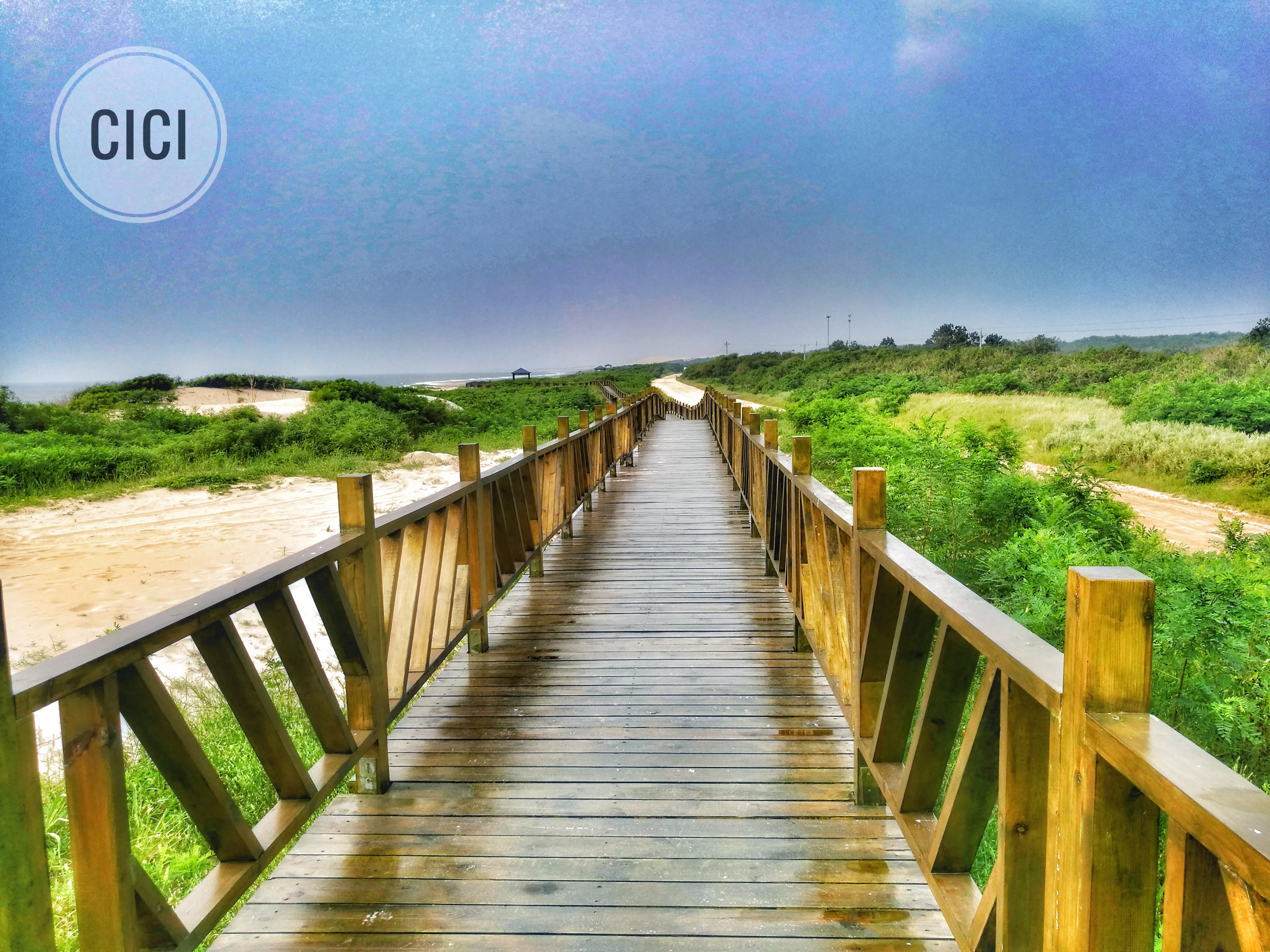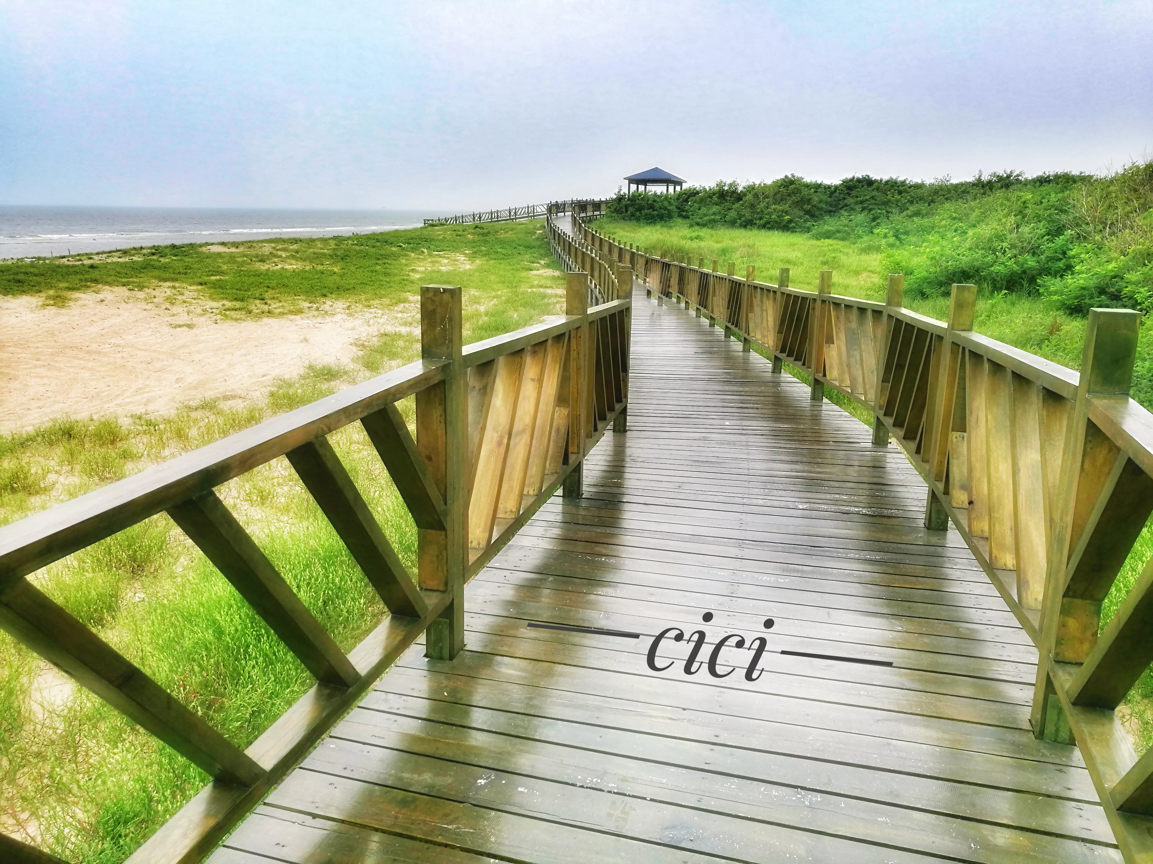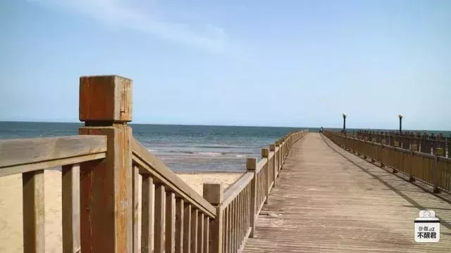 這里沙細、濰緩、水清、潮平。進入景區(qū),左邊就是一望無際的大海,海灘上厚厚的細沙,走起路來很困難。右邊是連綿起伏的沙丘和大片的綠植,沙丘上人性化的修了一條人行木棧道,往遠處看像一條巨龍又像小長城伸向遠方。木棧道又干凈又好走,隔一段就有一個休息亭,還有一個通向海邊的木梯,從遠處看好像是長城烽火臺。