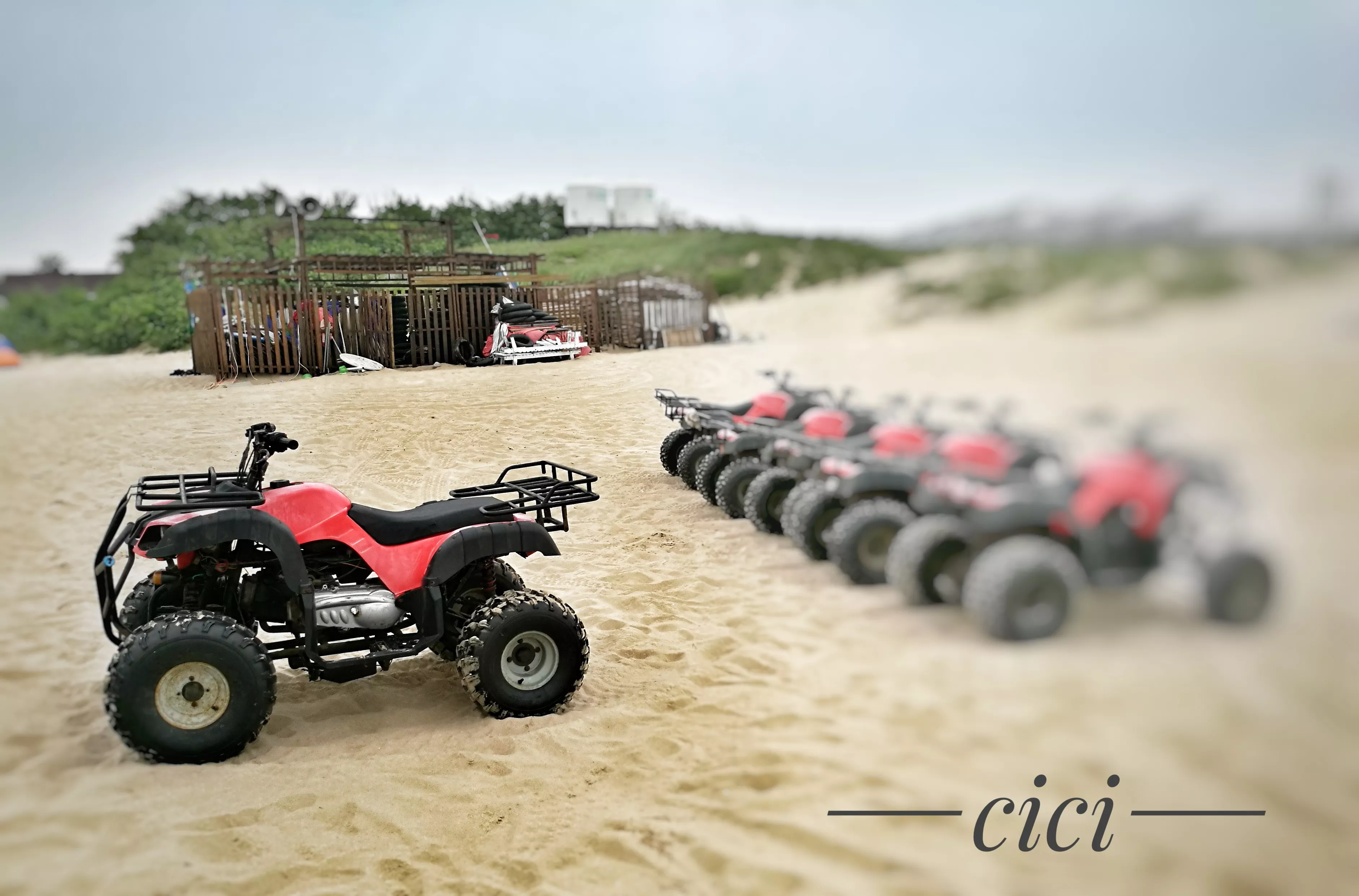 在棧道的盡頭,右邊有一個停車場,就是自駕的游客可以把車停在此處。左邊一片開闊的海灘上,停著幾輛沙灘摩托車,供游人騎行。