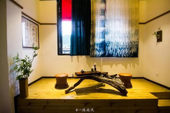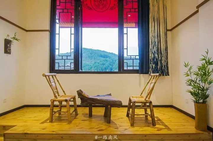 客棧的大堂擺放著一套傳統(tǒng)的中式沙發(fā),古風(fēng)濃郁,墻上掛滿花紙傘,文藝氣息厚重。