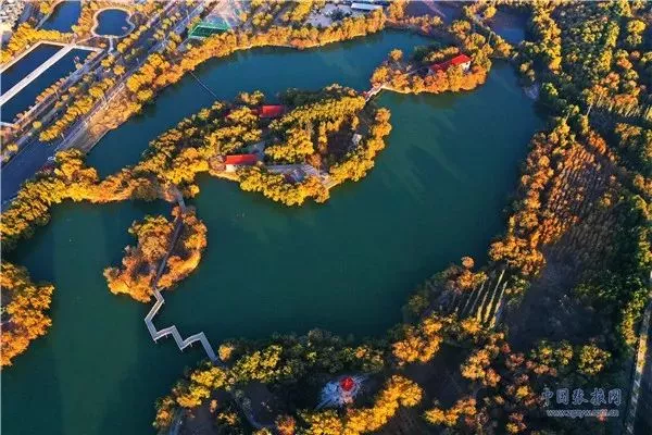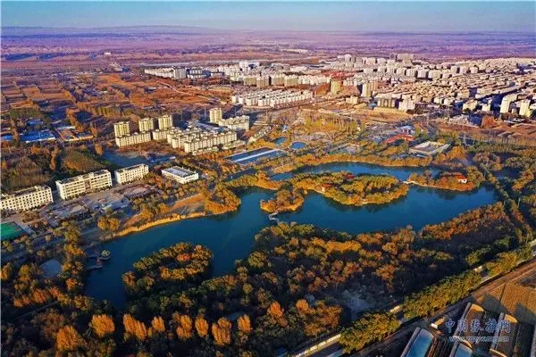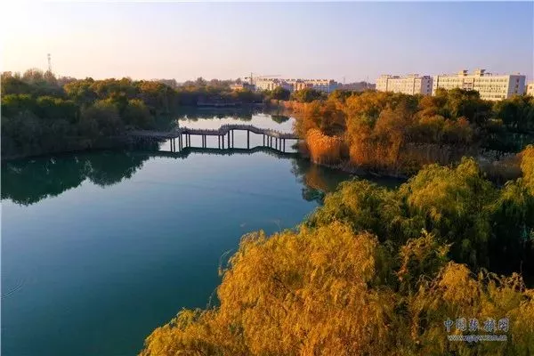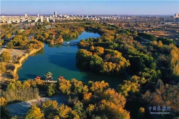 11月3日,深秋時(shí)節(jié)的張掖市高臺(tái)縣月牙湖公園,金柳垂似簾,湖面平如鏡,百米高空下俯瞰宛如一幅繪制在黑河濕地上的濃艷水彩畫(huà)卷。