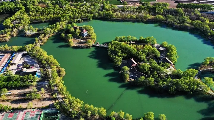 2020年4月25日,甘肅省張掖市高臺(tái)縣月牙湖公園,綠柳似簾,湖面如鏡,百米高空下俯瞰宛如鑲嵌在這座西北戈壁小縣城上的“綠寶石”。月牙湖公園占地面積558畝,其中水域面積186畝,湖面有五個(gè)島組成,島與島之間曲、拱、平橋相連。園內(nèi)風(fēng)景秀麗,小橋流水如畫(huà)如織,林蔭小道曲徑通幽,素有高臺(tái)縣城“后花園”之稱。