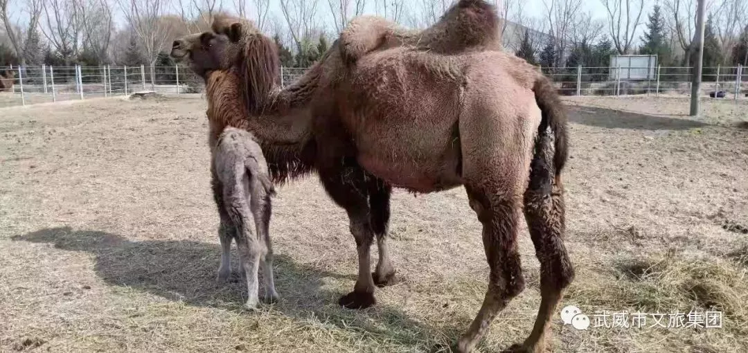 春回大地,氣溫回升,甘肅神州荒漠野生動物園野生雙峰家族喜添新丁,3月17日18點,一野生雙峰駝順利產(chǎn)下一幼崽。
