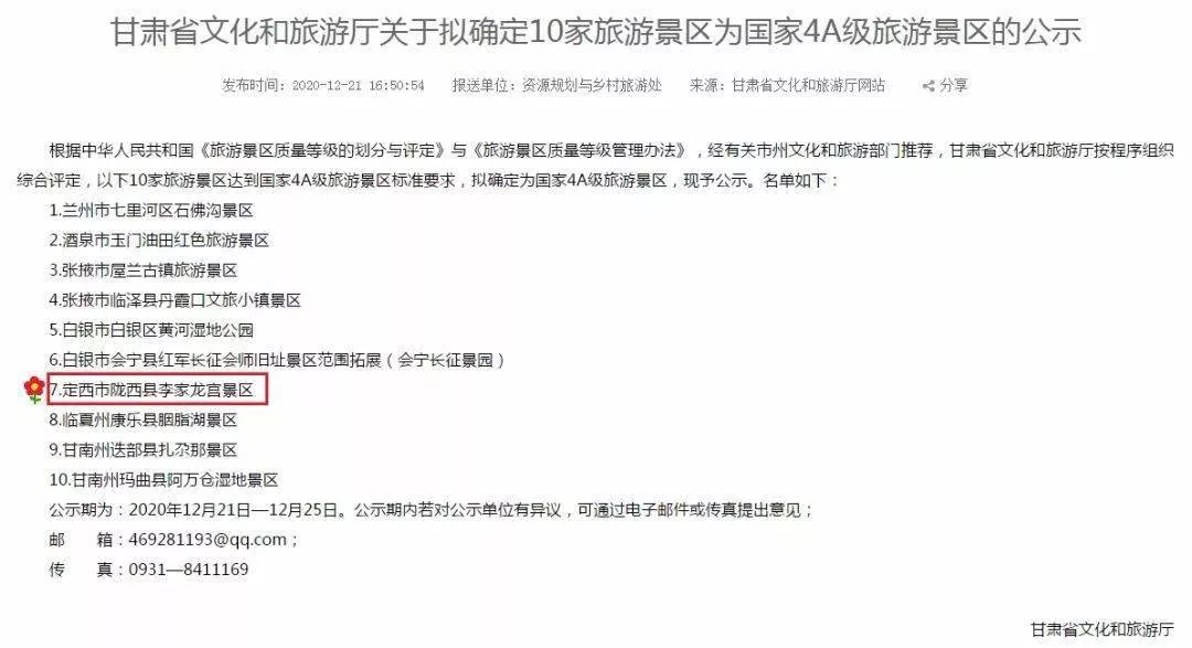 甘肅文化旅游廳關(guān)于擬確定10家旅游景區(qū)為國(guó)家4A級(jí)旅游景區(qū)