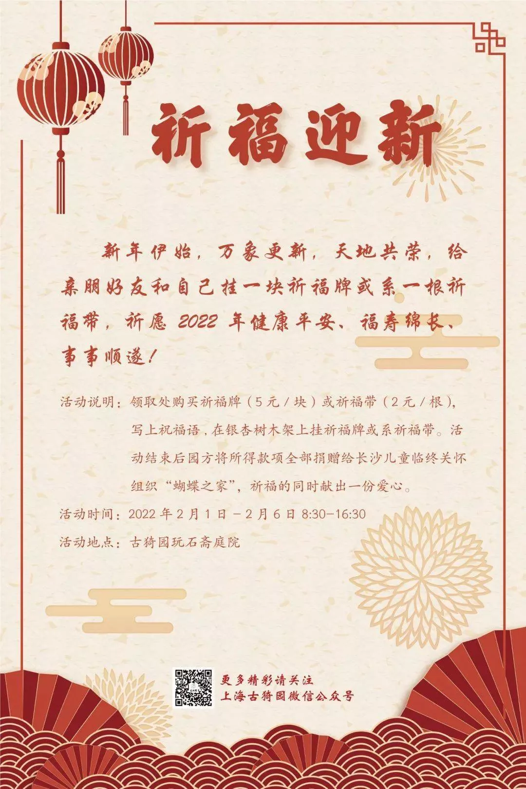 新年祈福是借助新舊交替時的萬物辭舊迎新氣象,借助吉祥的天時地利人和之氣,將這縷吉祥之氣接運到自身,讓吉祥幸福圍繞在自己的身邊?;顒悠陂g,游客可在玩石齋庭院“領(lǐng)取處”購買祈福牌(5元/塊)或祈福帶(2元/根)參與祈?;顒樱_啟一整年的好運氣。