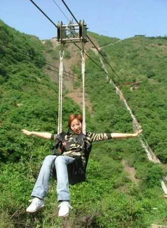 因?yàn)?是佛教中一個(gè)最大數(shù),比較吉祥, 所以999這個(gè)數(shù)字會(huì)給大家?guī)砑椤⒔】岛?幸福。 我們沒下多遠(yuǎn),便看到一群姑娘、小伙 子圍在滑索房。只見一位長(zhǎng)發(fā)飄逸的姑娘抓 牢吊環(huán)、系好安全帶后,“刷”地一下順著鐵 索滑向?qū)γ嫔桨?。姑娘嚇得長(zhǎng)喊一聲:“媽呀——”那略帶哭腔的喊聲尚未消失,人已被 接落在海綿墊上。