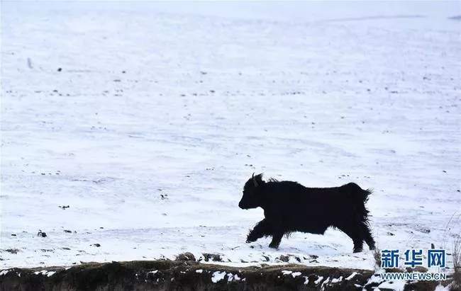 4月13日,在青海省海晏縣,一只牦牛在雪后的金銀灘草原上奔跑。 新華社記者 張宏祥 攝