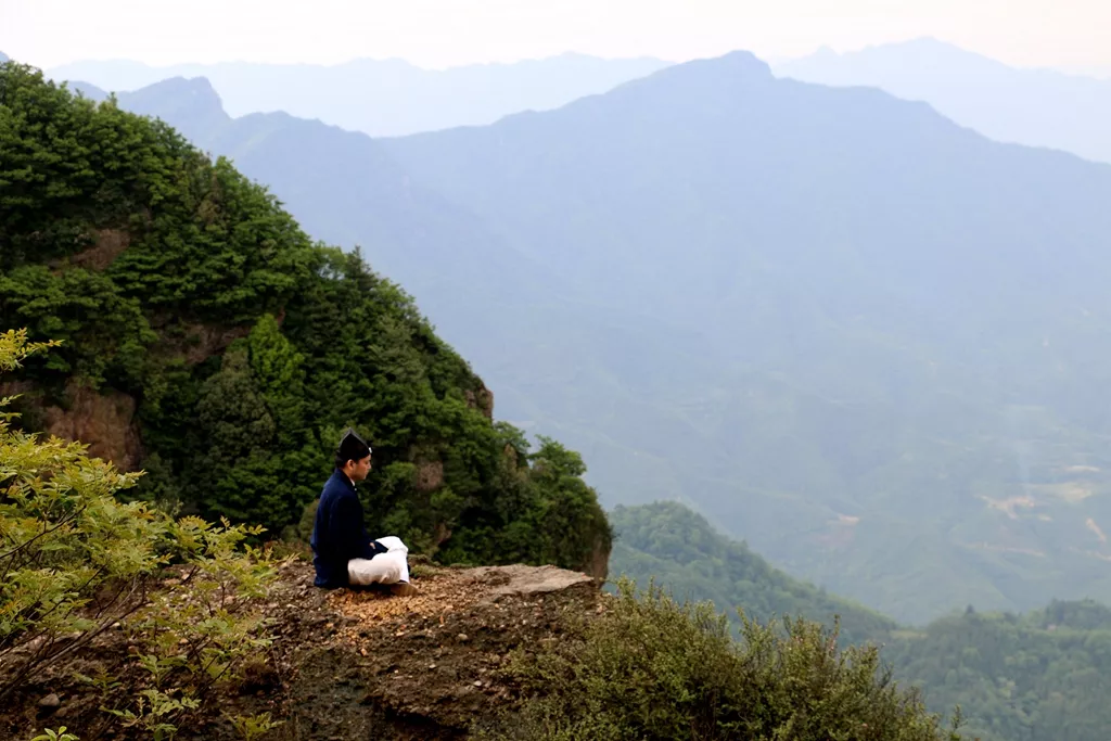 步行中,突見(jiàn)懸崖邊的巨石上有一道士打坐。巨石周?chē)歉叽蟮臉?shù)木遮掩,環(huán)境清靜,細(xì)看卻像剛才與我們相遇的采藥道士,他可真是神速啊,剛還與我們擦身而過(guò),現(xiàn)在卻在對(duì)面的山石上,不是神仙貹似神仙。