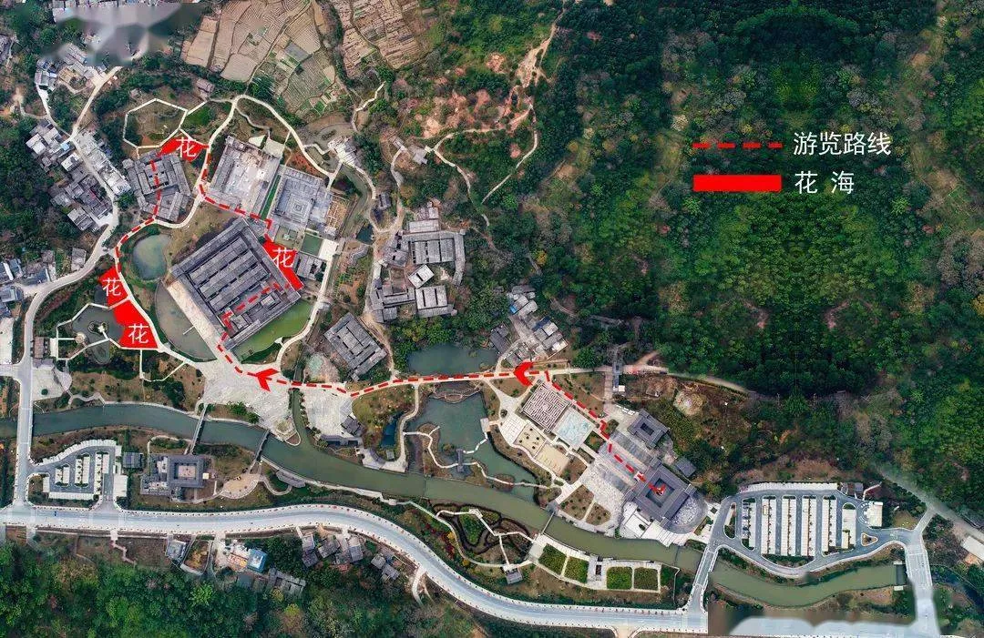 賞花路線:從游客中心立木廣場→客家圍屋地圖關(guān)西新圍→小花洲(格?;ā偃站眨?a href='/jingdian/14663' target=_blank>田心圍→半月池(玫瑰池拍照打卡)