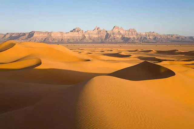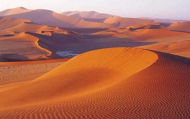 沙丘輪廓清晰、層次分明;丘脊線平滑流暢,迎風(fēng)面沙坡似水,背風(fēng)坡流沙如瀉。站在大漠深處沙山之巔,可靜觀大漠日出的絢麗,目睹夕陽(yáng)染沙的繽紛,贊嘆“大漠孤煙直,長(zhǎng)河落日?qǐng)A”的壯景。