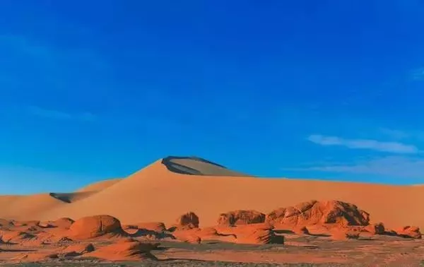 南湖大沙漠沙丘輪廓清晰,其地形有沙窩地、蜂窩狀沙地、平沙地、波狀沙丘地、魚鱗紋沙坡地、沙漠戈壁混合地等地貌,層次分明,丘脊線平滑流暢,迎風(fēng)面沙坡似水,背風(fēng)面流沙如瀉,站在沙山之巔,可靜觀大漠日出的絢麗,目睹夕陽(yáng)染沙的繽紛,贊嘆大漠孤煙長(zhǎng)河落日的壯景。