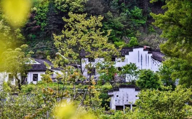 在兩座小山崗之間,是散落在林間的民房,粉墻黛瓦、錯(cuò)落有致