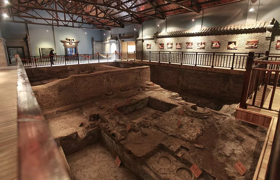 從景酒歷史文化長廊出來,記者一行又來到了“南校場燒鍋遺址”。這里占地面積400平方米,窖池100余個,是當(dāng)年景芝“七十二座燒爐”之一。此中有舊時粉碎石磨、天鍋蒸餾、陶甕發(fā)酵等古法工藝,充分展示了明清時期景芝釀酒景象,是迄今為止國內(nèi)白酒業(yè)保存比較完好的古代釀酒作坊之一。