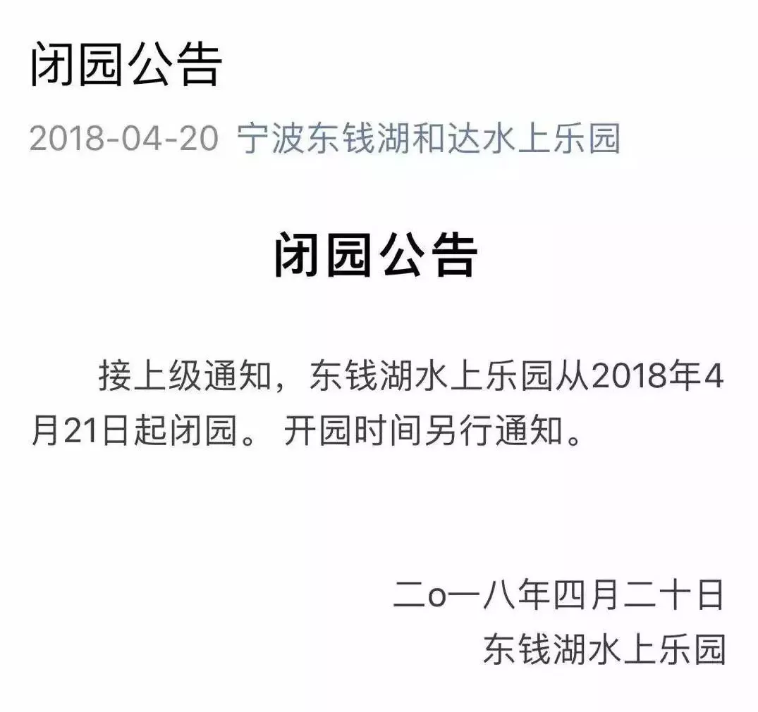 這幾天,寧波天氣是越來越熱了,本該是水上樂園開園之際,但就在昨天傍晚,東錢湖水上樂園官方微信號發(fā)布了閉園公告: