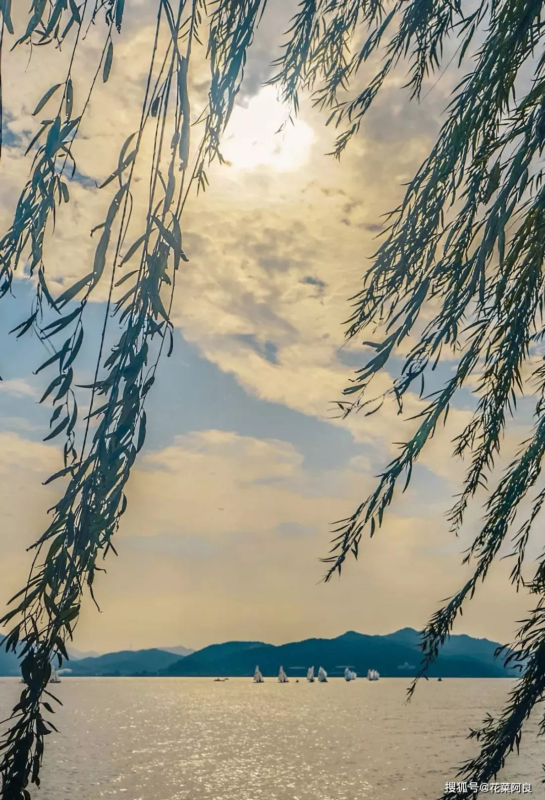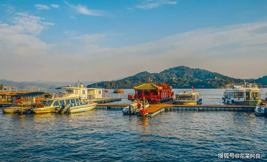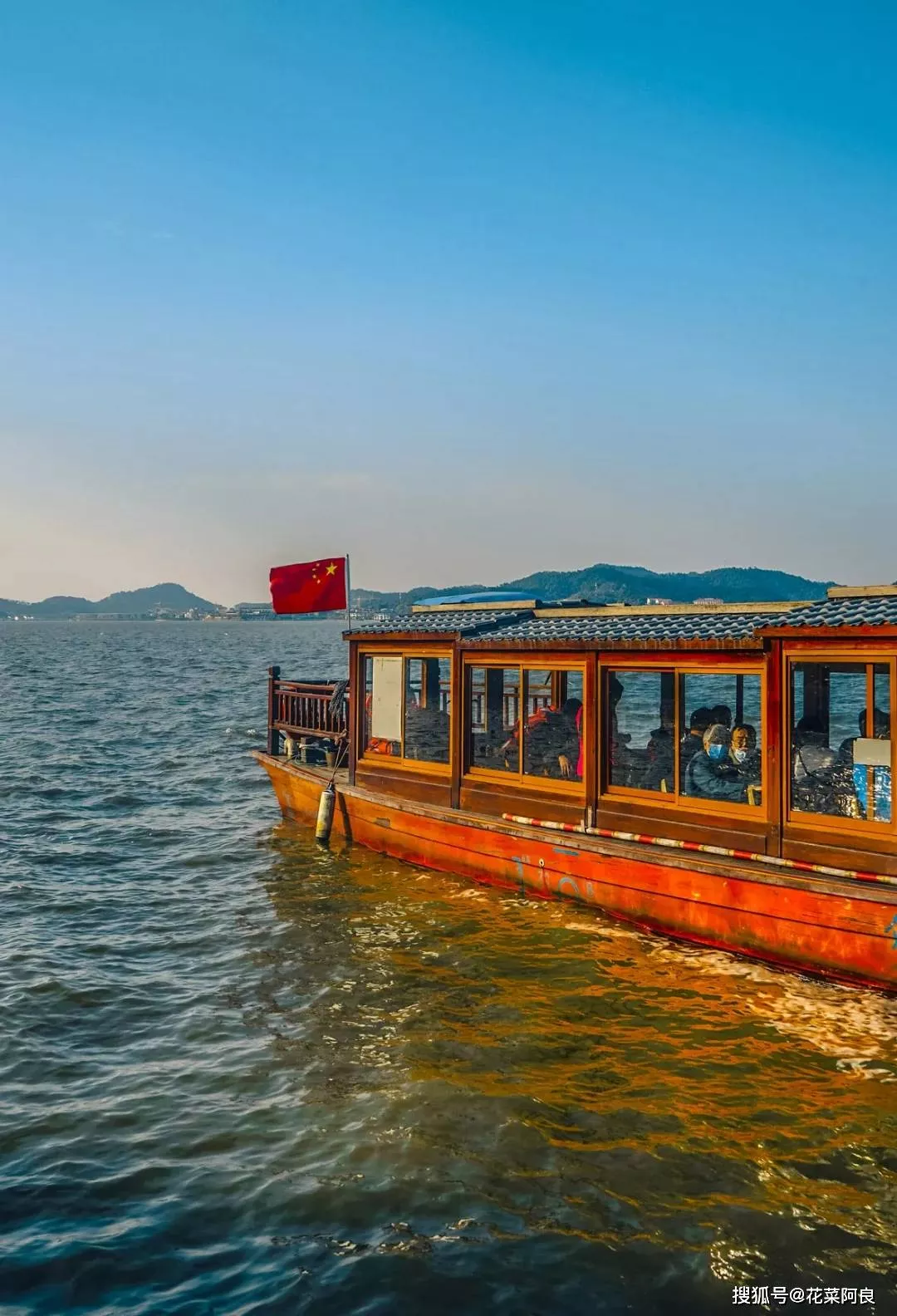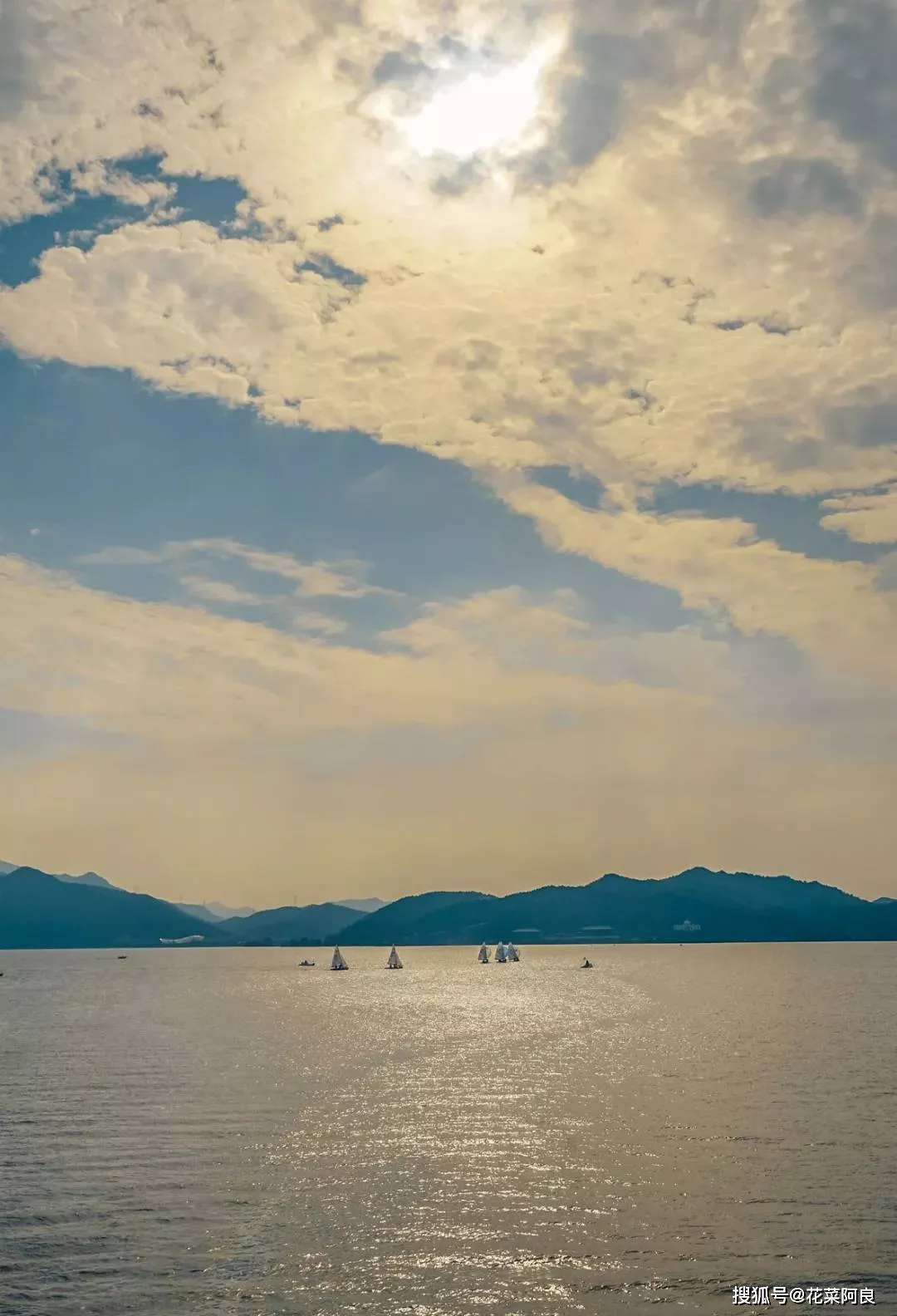 東錢湖是靜謐的,落日余暉灑在港口處。碼頭上各色游船,湖面上波光鱗鱗,層層水浪。遠眺迎風破浪,影綽起伏的點點白帆。游船停泊在港內,湖水拍打臺階聲聲作響。這時東錢湖的靜謐,是需要細細去體會的。