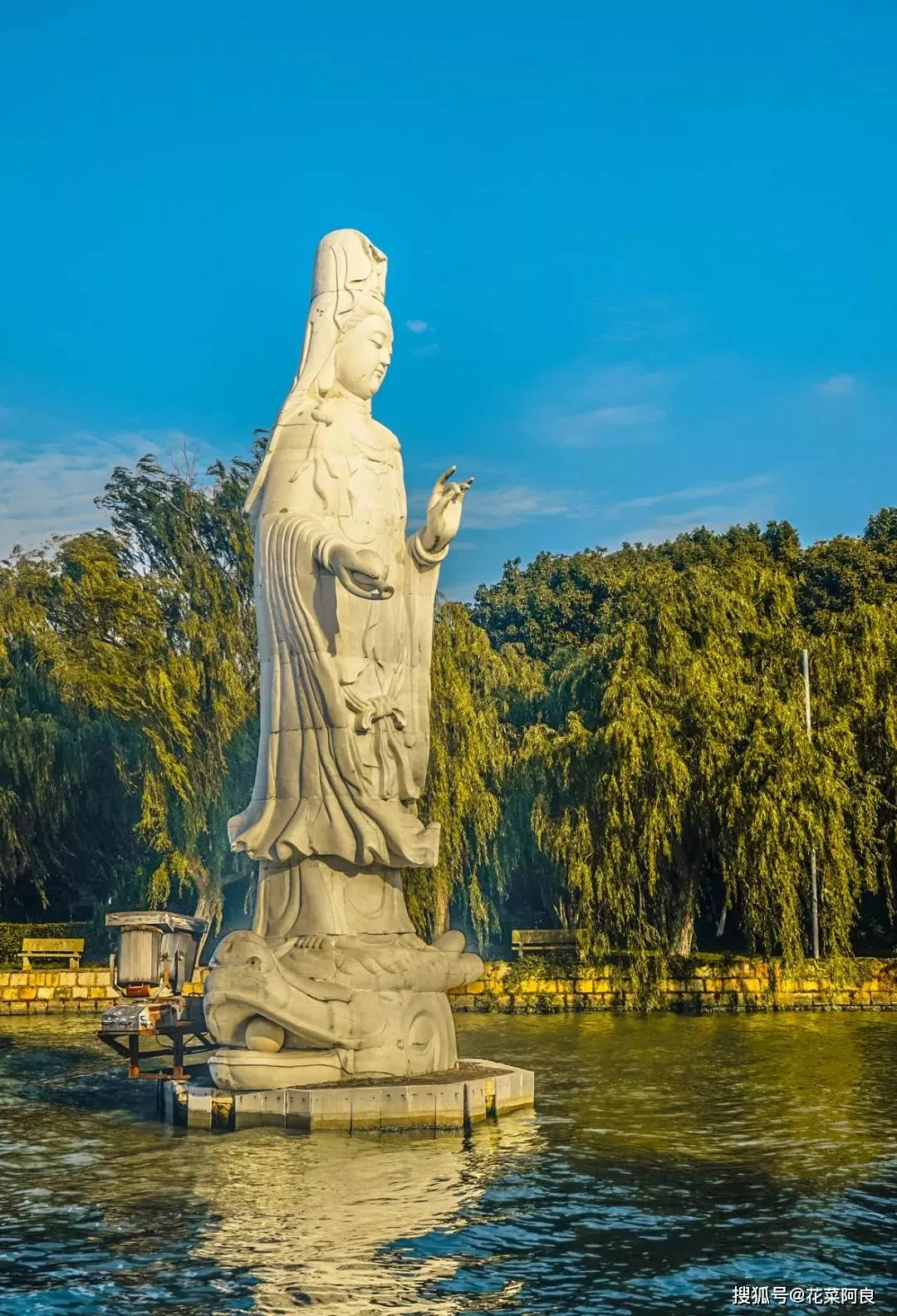 霞嶼禪寺東門的湖邊上,立有一尊十米高的水月觀音,取山東雪花白花崗石雕琢而成,通體雪白。觀音手執(zhí)凈瓶,慈祥寧靜,眉目低垂,腳踏龍子,以瀲滟水色為蓮,青山綠意為景,站立于微波的湖水之上。