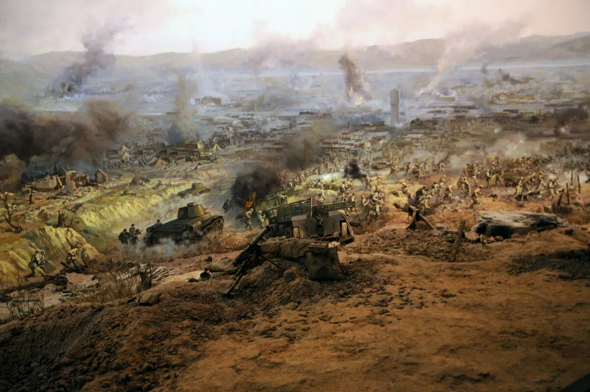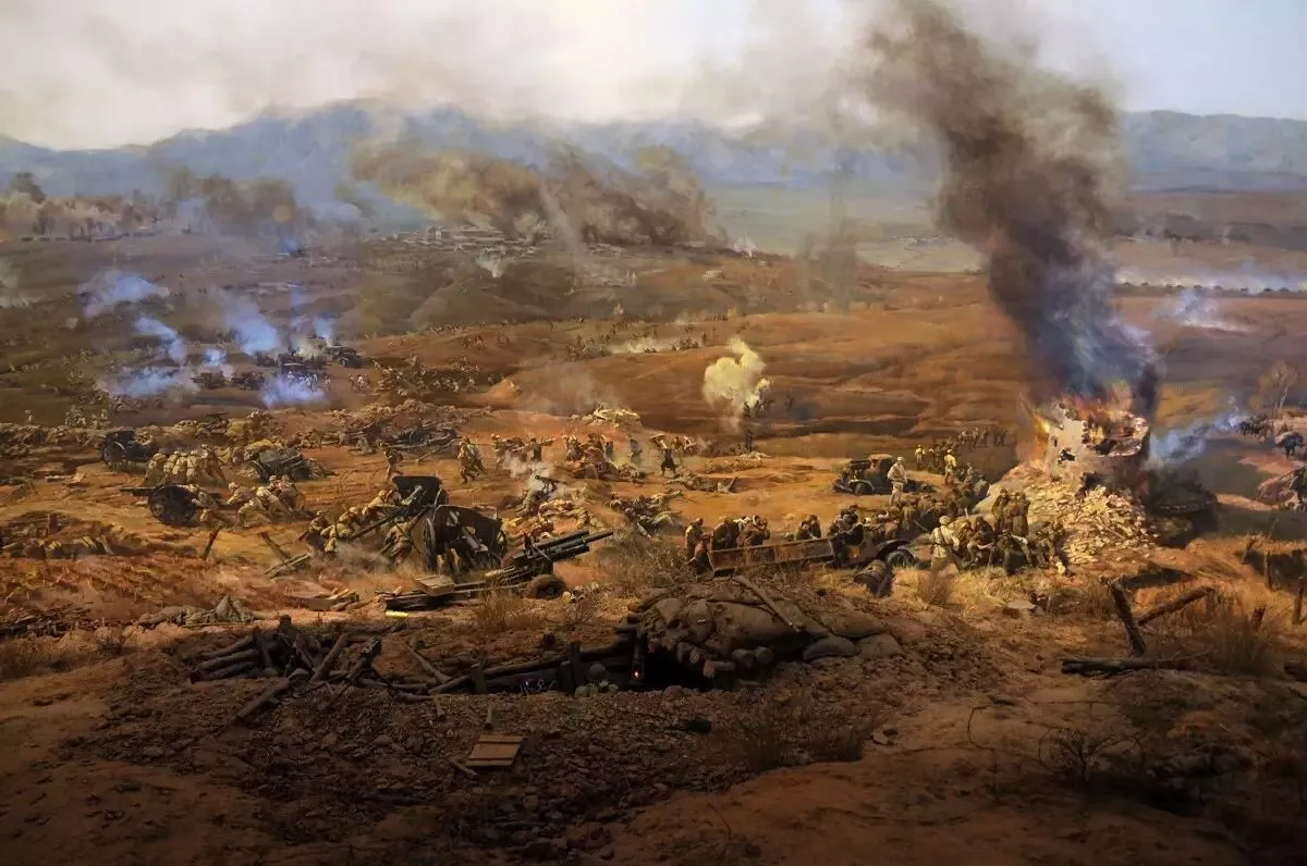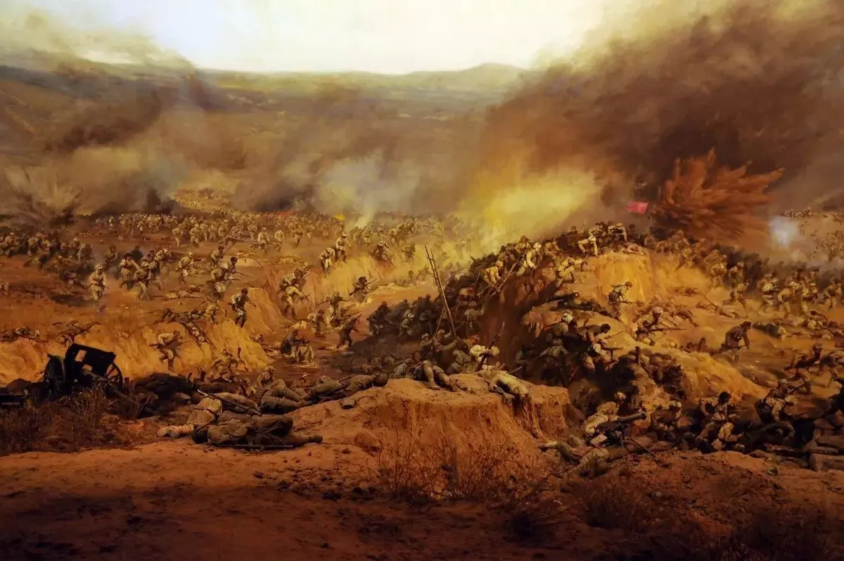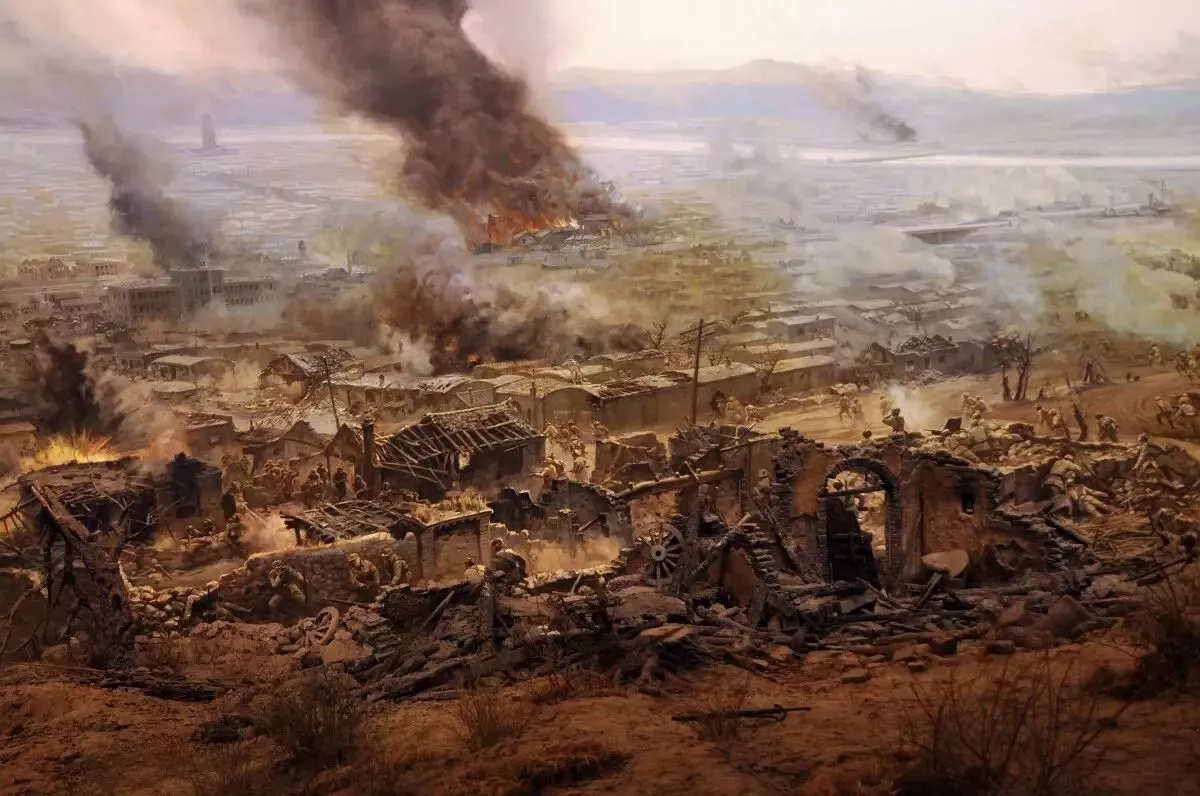 畫的南面,表現(xiàn)的是南、東突擊集團第7、第9、第8縱隊在炮縱一部配合下,由南向北、由東向西突擊,攻占敵軍罕王殿山、老爺嶺和紫荊山等據(jù)點,尖刀連、突擊連搶占突破口,迅速突破小凌河等處城垣。前赴后繼,“四豎紅旗”的勇士們的形象,各縱隊沖進城區(qū),向縱深勇猛穿插,攻擊敵人防守據(jù)點,與敵人展開逐街逐巷爭奪,攻占敵第6兵團司令部、東北“剿總”錦州指揮所,殲滅老城殘敵的場面,在畫中都得以充分體現(xiàn)。全景畫再現(xiàn)了經(jīng)過31小時激戰(zhàn),全殲10萬錦州守敵,攻克了戰(zhàn)略重地錦州,取得了遼沈戰(zhàn)役關鍵性勝利的戰(zhàn)斗過程。