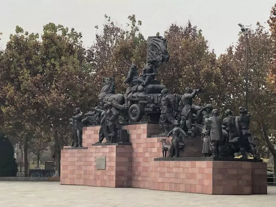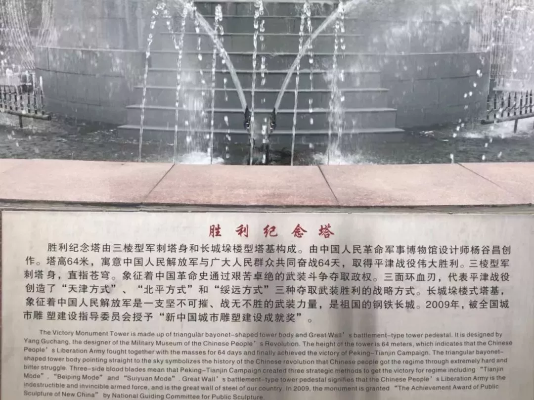 這是勝利紀(jì)念塔。塔高64米,寓意中國(guó)解放軍與廣大人民群眾共同奮戰(zhàn)64天。三棱型的軍刺塔身,直指蒼穹,攝人心魂。