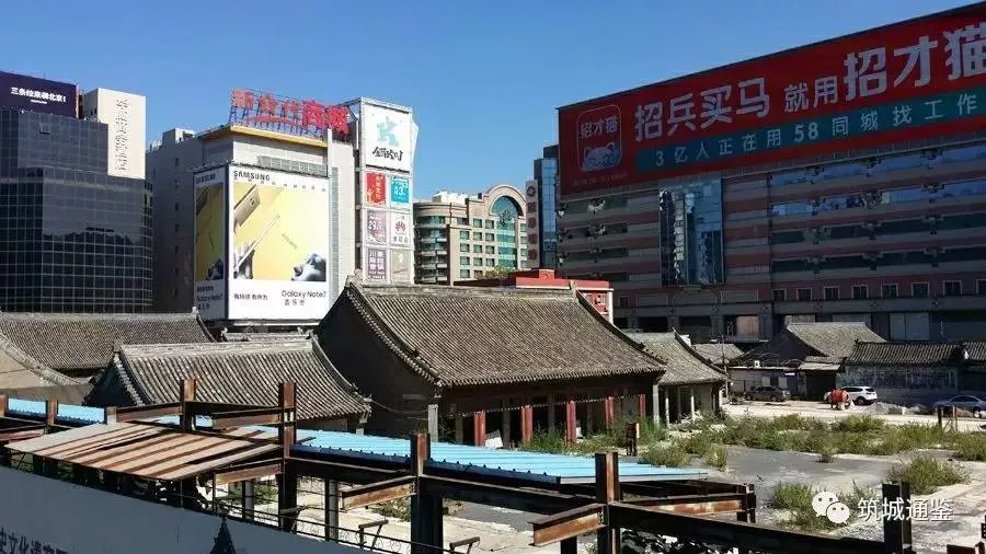 除去國(guó)立蒙藏學(xué)校舊址仍為殘存的平房院落之外,在西長(zhǎng)安街至靈境胡同之間的西單北大街東西兩側(cè)已被以商業(yè)百貨為主的高樓大廈占滿。國(guó)立蒙藏學(xué)校舊址呈現(xiàn)為被大體量高層商業(yè)綜合體包圍的態(tài)勢(shì),南側(cè)為漢光百貨,北側(cè)為西單購(gòu)物中心和新一代商城,東側(cè)為西單明珠市場(chǎng),西側(cè)隔西單北大街為北京君太百貨。擱置數(shù)年的學(xué)校舊址現(xiàn)為被高高的廣告欄板圍著的空置狀態(tài),從架設(shè)于西單北大街上的人行過(guò)街天橋上可以俯瞰院子中已經(jīng)殘缺破敗的古建筑,呈現(xiàn)出荒蕪落寞的慘淡景象。這種景象或許暗示其背后仍處于不同利益方博弈的膠著狀態(tài)。
