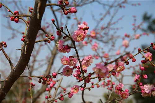 美人梅,落葉小喬木或灌木,由瓣宮粉型梅花與紅葉李雜交而成,法國(guó)引進(jìn)?;ǚ奂t色,數(shù)量繁密,花態(tài)近蝶形,瓣層層疏疊,瓣邊起伏飛舞,花心常有碎瓣,婆娑多姿,絢麗奪目,嫵媚可愛(ài)。
