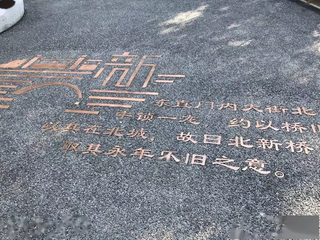 公園的一個(gè)小亮點(diǎn),是記錄了北新橋的歷史。據(jù)《北京地名談》記載,“東直門(mén)內(nèi)大街北新橋精忠廟有井,中鎖一龍,約以橋舊釋出,因名曰新橋。以其在北城,故曰北新橋,取其永年不舊之意。”據(jù)區(qū)園林綠化局規(guī)劃發(fā)展科項(xiàng)目負(fù)責(zé)人介紹,他們查閱了大量文獻(xiàn),找到了北新橋的故事,《北京地名談》比較權(quán)威,所以就把這段記載以銅鑄字的形式鋪裝在地上。