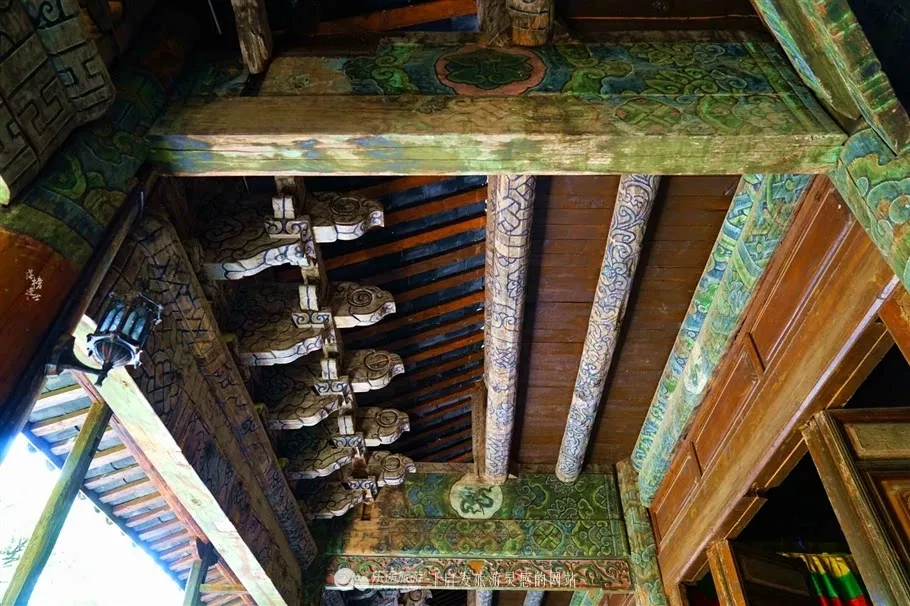 精美的木門。大寶積宮現(xiàn)存壁畫558幅,是麗江壁畫收藏最多的地方。壁畫融漢、藏、納西文化一體,眾教合一,展示了藏傳佛教和儒、道等生活故事。