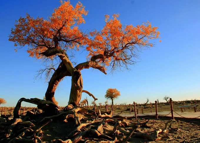 電影《英雄》里,張曼玉與章子怡身著大紅色的裙衣在金黃色世界里打斗的畫面,就是在秋日內(nèi)蒙古額濟納旗的胡楊林。