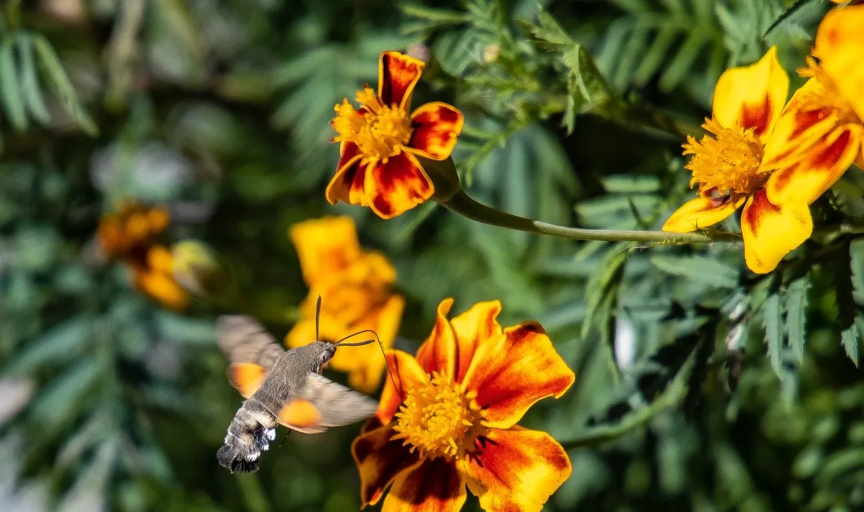偶然花叢中看到一只蜂鳥鷹蛾,它被稱為昆蟲世界里的“四不像”。像蝶,和蝶一樣白天活動(dòng),口器是長(zhǎng)長(zhǎng)的喙管,且有尖端膨大的觸角,還有色彩繽紛、美麗炫目的翅膀;像蜜蜂,飛舞于百花叢中采食花蜜,并發(fā)出清晰的嗡嗡聲;它還像蜂鳥,時(shí)而在花間盤旋,時(shí)而在花前疾馳。