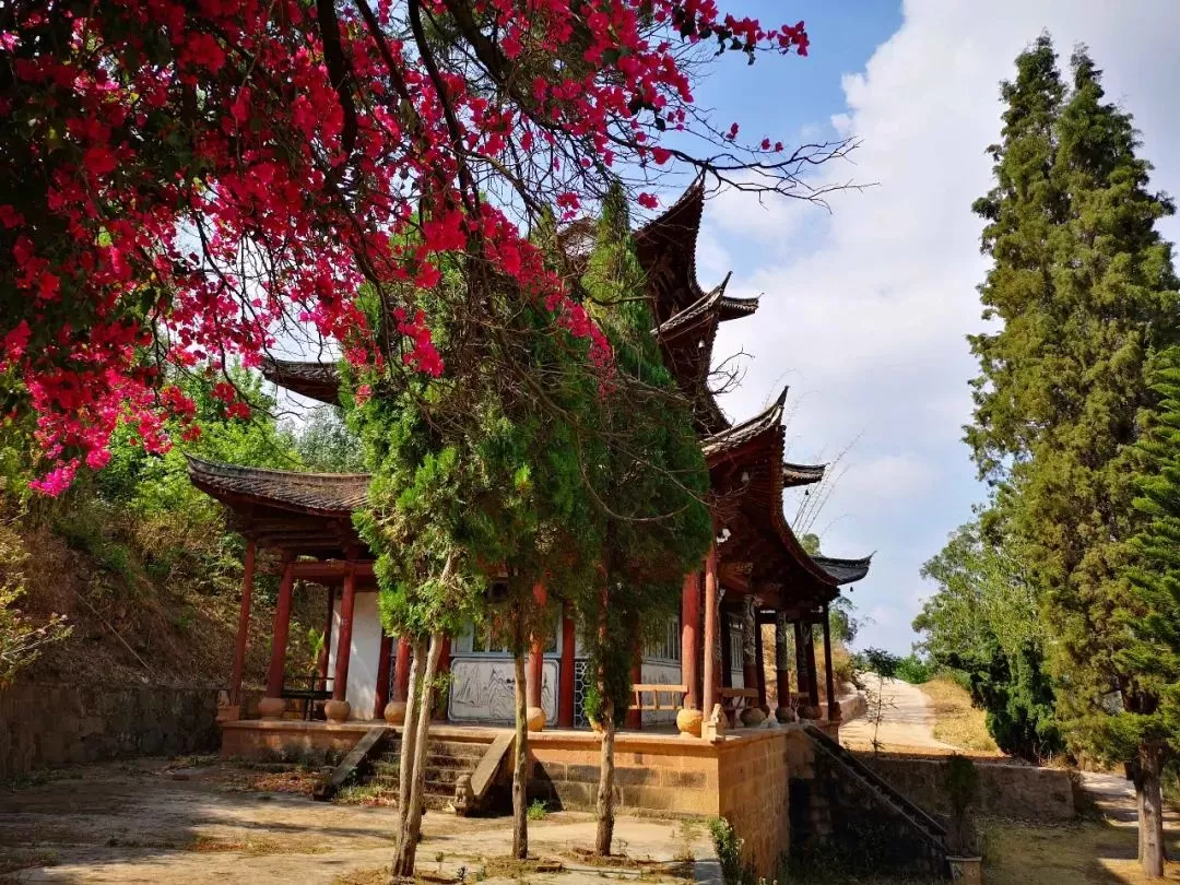 是何庵處于半山腰處,右邊可俯瞰下方鄉(xiāng)鎮(zhèn)全景,左邊有一株三角梅,開得正燦爛,三角梅后邊是一排簡易房子,從布置看應(yīng)是廚房廂房,可能是管理打掃的人居住的,不過如今卻是荒廢著。