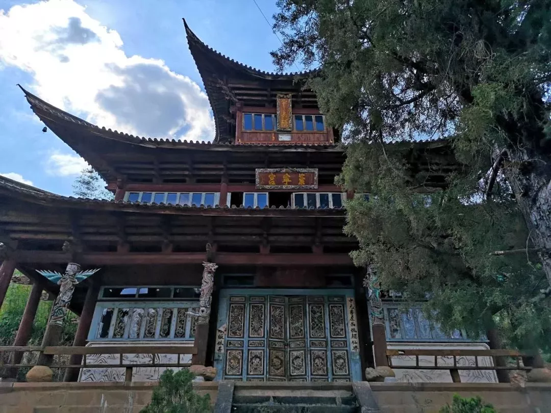 廚房前面有一條石階小路,兩旁長滿花花草草,路的盡頭是一座古樸的建筑,寫著財神殿,滿是彩繪和壁畫。房前有兩株柏樹,高大粗壯,不知長了多少年。