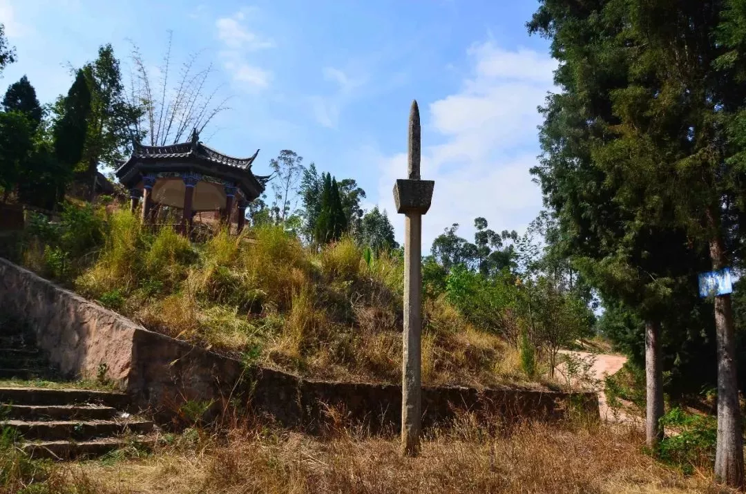 拐過一個大坡后出現(xiàn)一片小樹林,林中有一條小道長滿荒草,盡頭是一塊石碑,走近了看上面寫著陳翼叔墓。碑記上記載著陳翼叔的生平簡介,生于云南省蒙化府盟石村,名叫陳佐才,字冀叔,別號睡隱子,是明末清初詩人,一生忠于明朝。