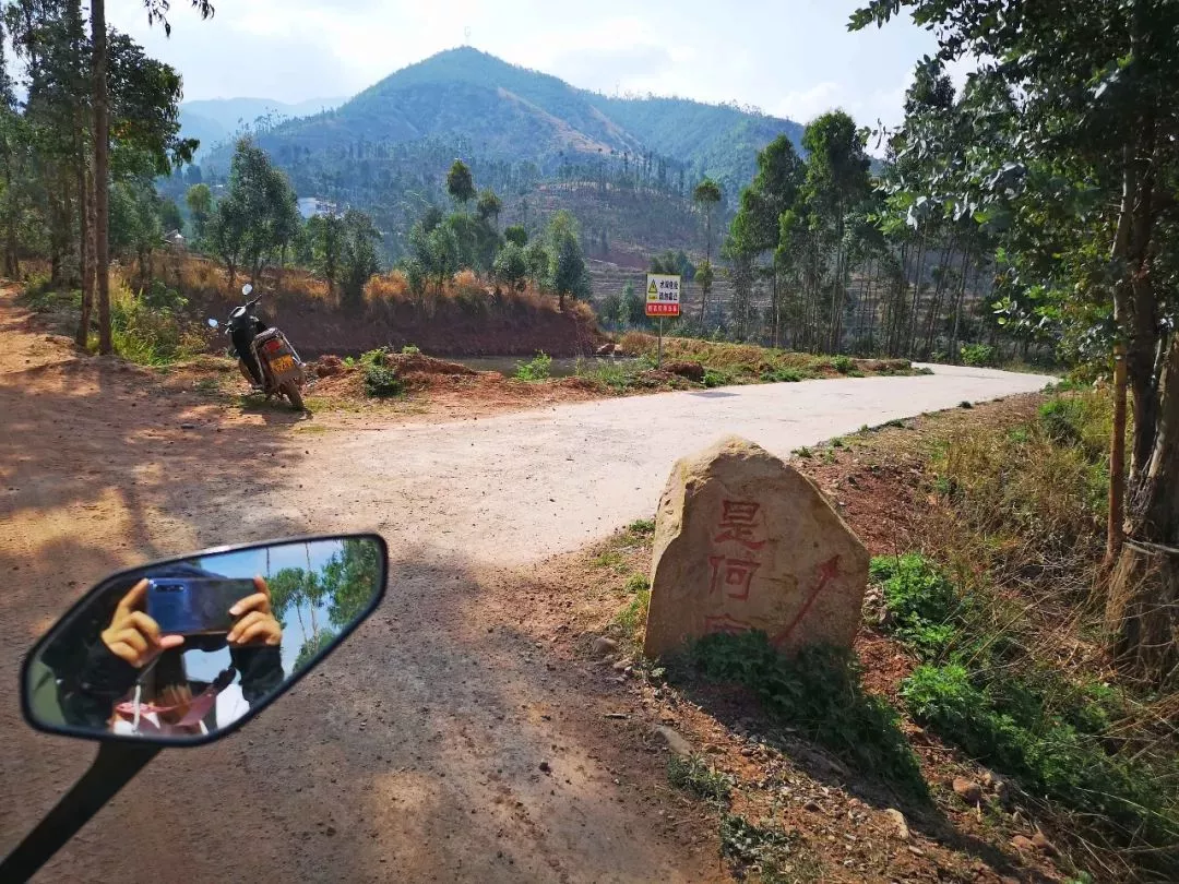 穿過村莊后一路開始上坡,到坡頂后有一個箭頭指示方向,開始大下坡和大上坡,電動車無法前行,于是走路上山。