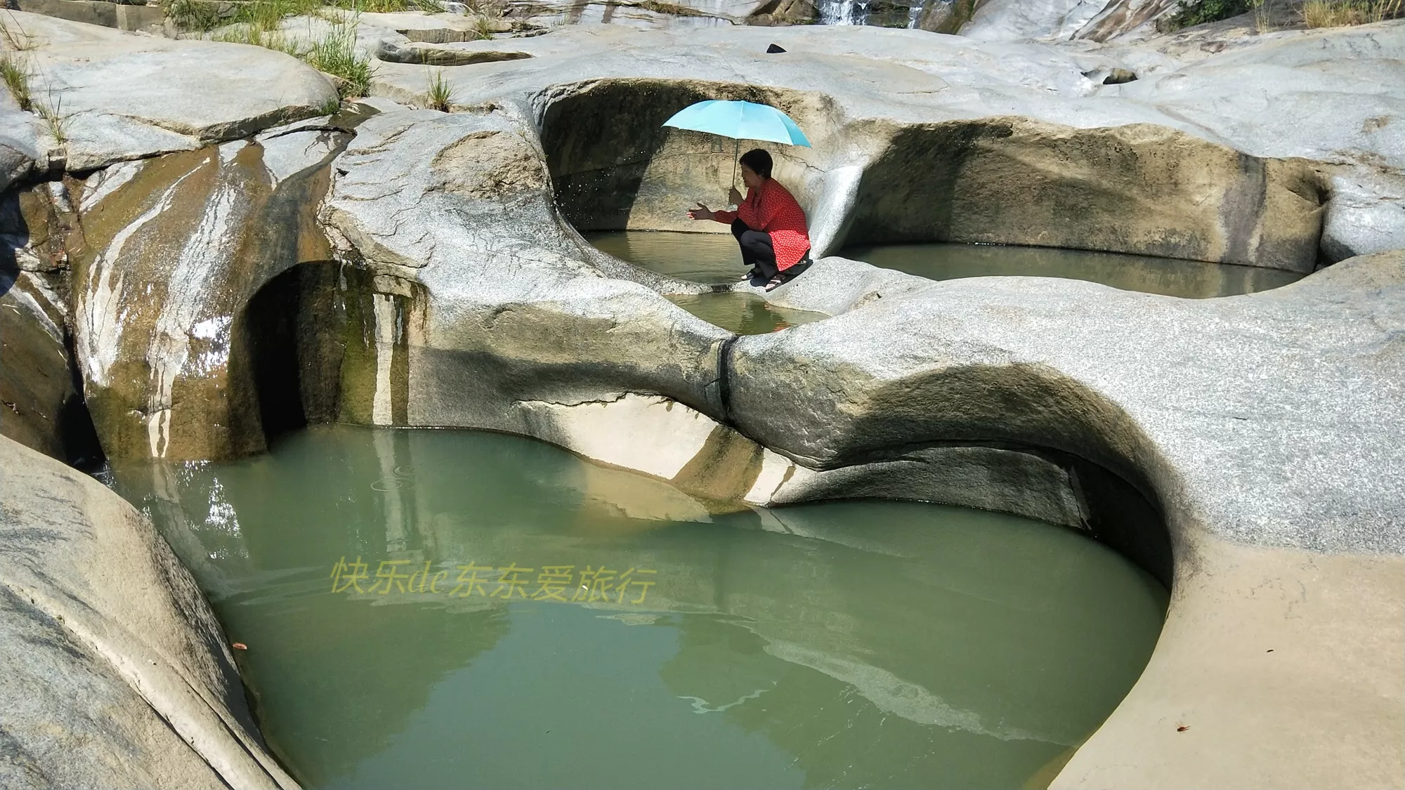 九重坑上面有一段比較平緩的河段,河底也有不少巨石。巨石長期被流石和洪水沖刷,上面也有不少形態(tài)各異、深淺不同的石臼,看起來也很有趣,安全性也高得多。這里拍照很愜意。