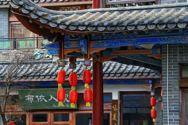 客棧位于古鎮(zhèn)的布依水鄉(xiāng),有著鮮明的布依風(fēng)格。客棧外觀是仿古建筑風(fēng)格,外墻上爬滿了綠植,郁郁蔥蔥。