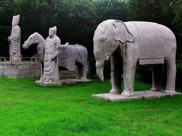 墓區(qū)前首,是一座雕工頗精的石坊,上刻“潞藩佳城”楷書。石坊東西兩側(cè)并列石華表兩座,雕云龍圖案。過石坊進(jìn)入長(zhǎng)189.5米神道,兩旁排列石人、石獸15對(duì),形象有文臣、獬豸,狻猊,麒麟、駱駝、象、羊、馬及神化了的其它怪獸,或立或蹲或臥,形態(tài)各異,栩栩如生。石人、石獸均采用整塊青石雕成,其中最大者高2.77米,最小者亦有1.55米。四百多年來,雖經(jīng)歷代滄桑,風(fēng)雨剝蝕,仍保存完好,細(xì)部紋飾清晰,實(shí)為難得的一批藝術(shù)珍品。