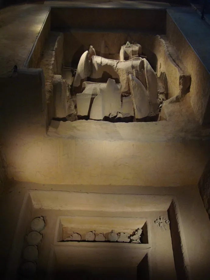 這里就是第一展廳了。走進(jìn)展館,會(huì)發(fā)現(xiàn)這里分為三個(gè)部分:隨葬物品展區(qū);一號(hào)車馬坑(中字墓);貴族墓葬。1號(hào)車馬坑于2001年4月發(fā)掘,內(nèi)葬多種豪華實(shí)用車輛20輛和許多馬骨。