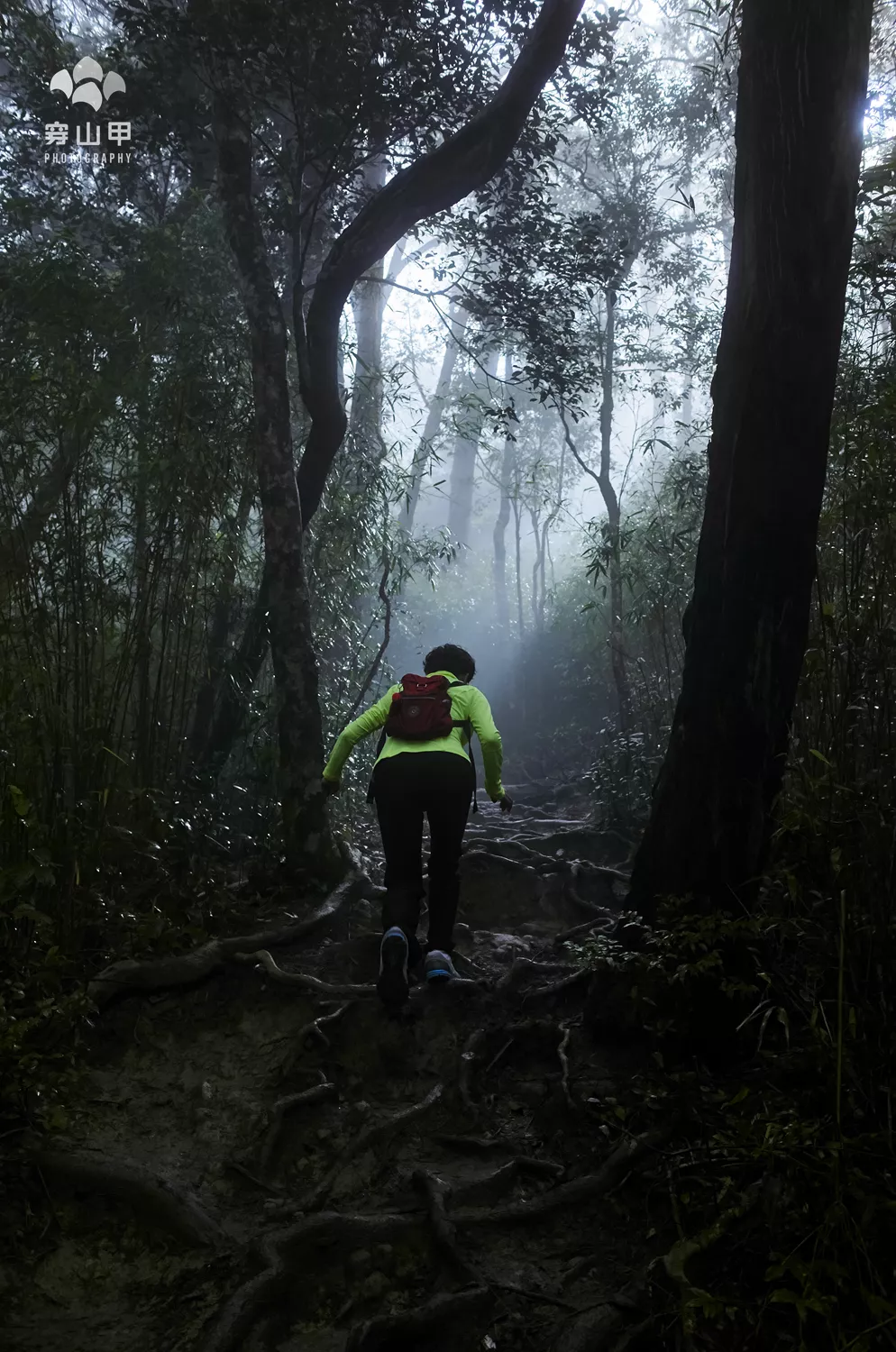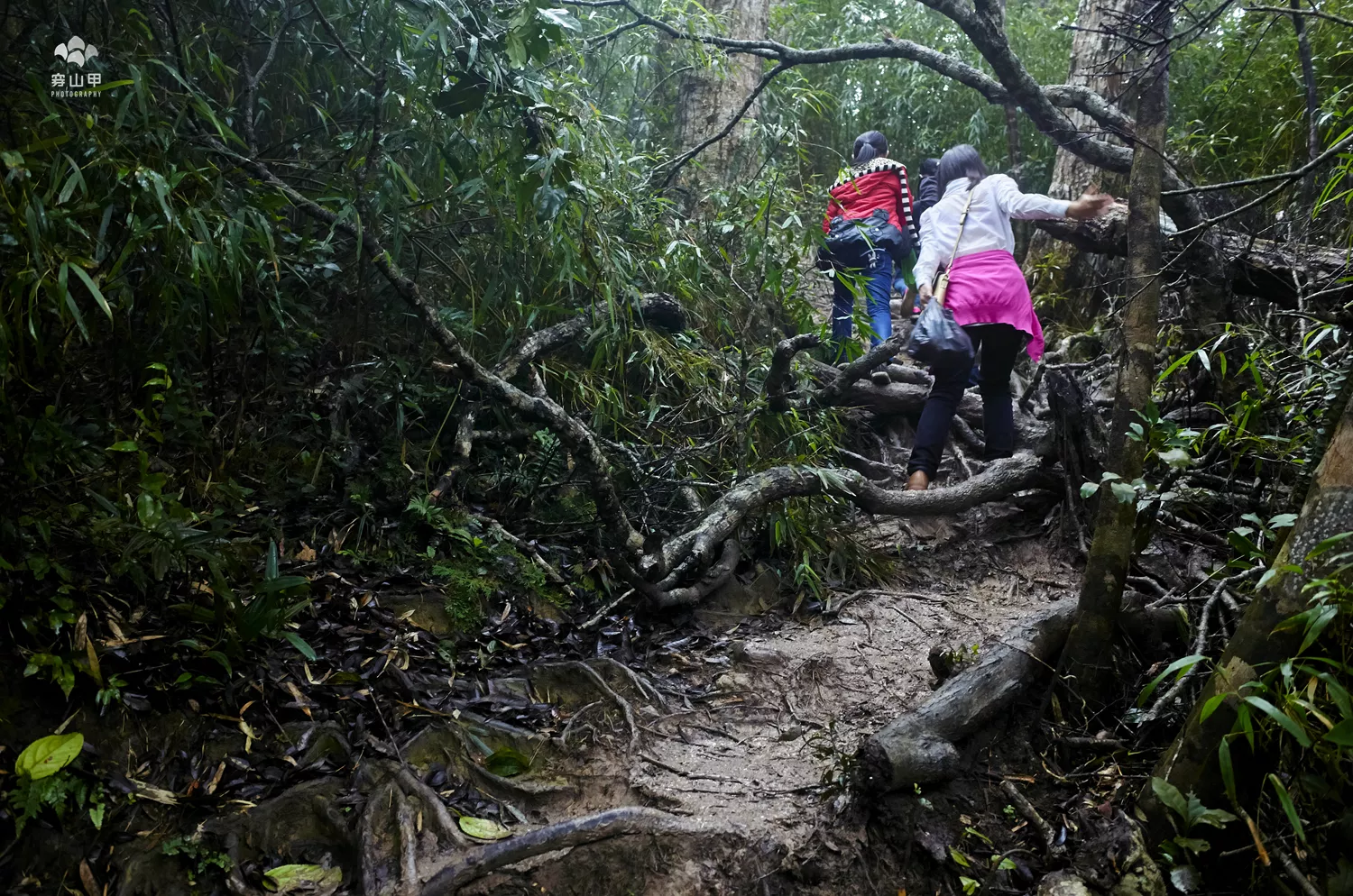 ▲天空下著小雨,地面非常濕滑泥濘,過了正式的登山棧道之后,這里已經(jīng)沒有了兩側的保護欄桿,更沒有了棧道和石板,就是山林間的一條小路,剛開始就遇到了“樹根路面”,地面上盤根錯節(jié)的樹根,與溫帶地區(qū)的樹根(枝)不同,它們在地面上肆意伸展,并具有非常強的韌度。不過有一點好處,就是很難折斷,還有一定的彈性,不管是踩在腳下,還是抓在手里都足可以信賴。地面上這些被雨水打濕的樹根還是相當濕滑的,登山鞋每一次與樹根的接觸都要十分小心,以防腳底打滑。