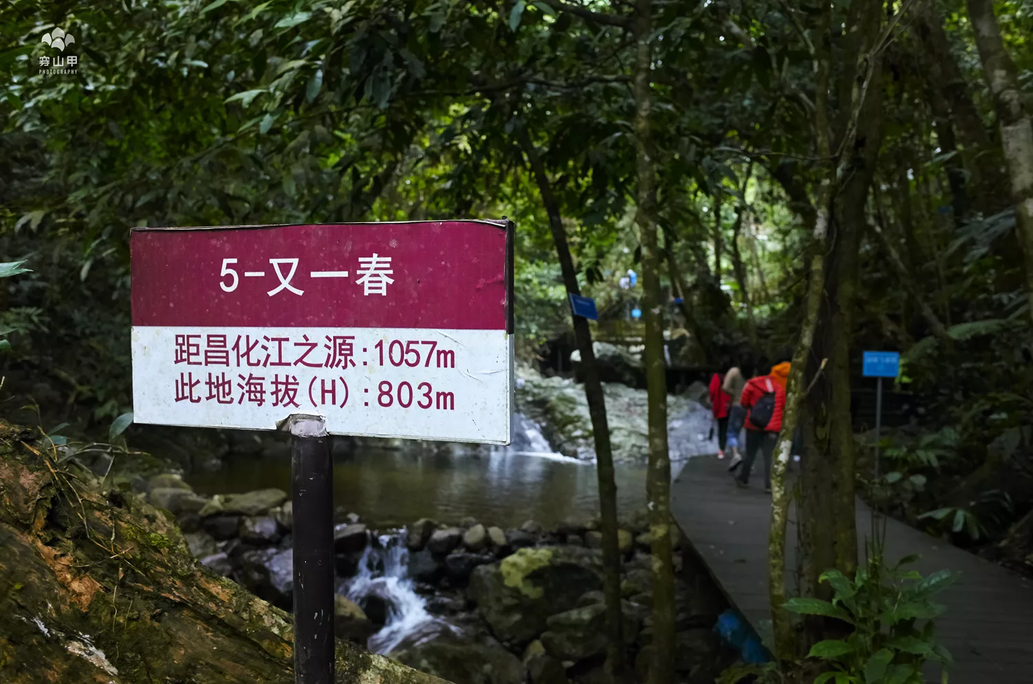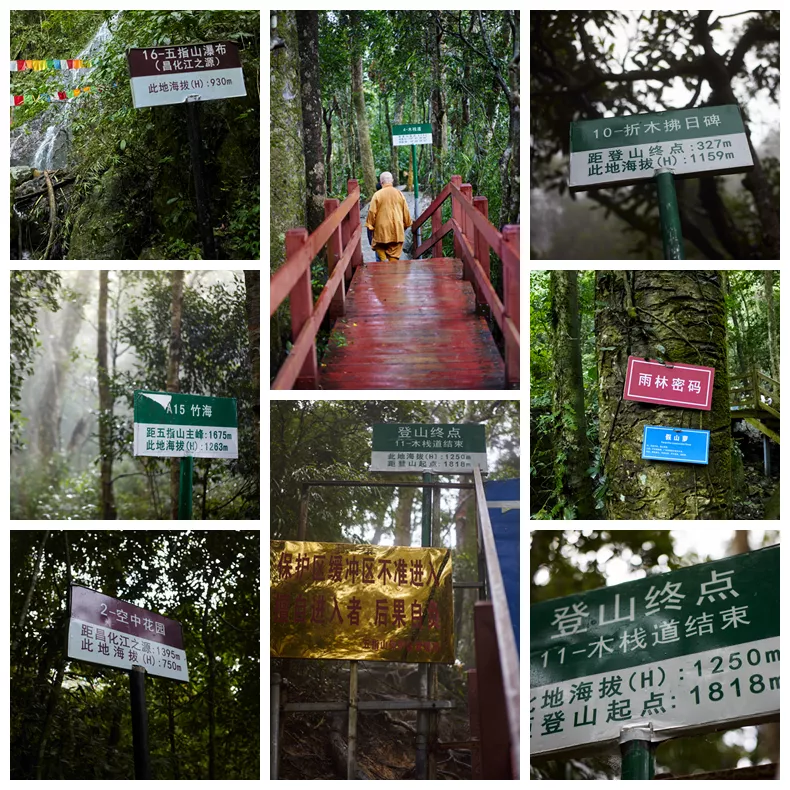 ▲在登山的過程中,我開始注意到這種有編號的牌子,后來才知道從登山起點到二峰峰頂沿途共有31個這樣的牌子,它們標識了沿途的一些特征景物,此點的海拔高度和距離頂峰的距離等參數(shù),需要說明的是,此牌上面所說的“距登山終點”并不是指主峰峰頂,而是指景區(qū)內(nèi)修建的爬山道路終點。兩條線還以不同的顏色區(qū)分,綠色代表登山路線,紫紅色代表昌化江之源方向。