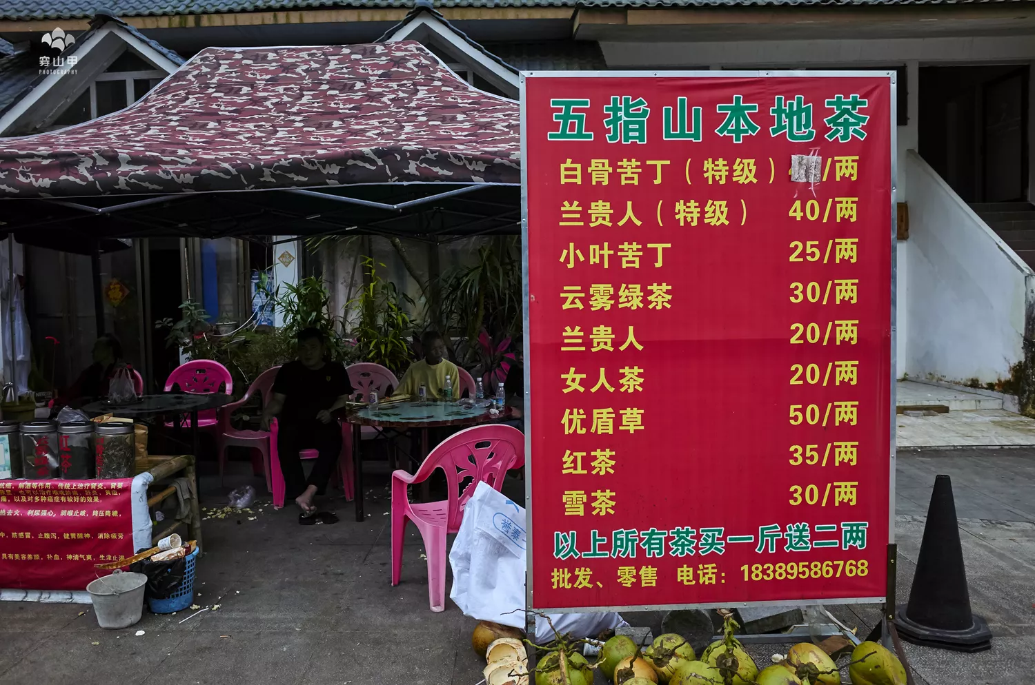 ▲在五指山景區(qū)門口看到的茶館,大大的遮陽傘下幾個桌子,一些椅子,竟然也坐滿了茶客,門口的大牌子上寫著出售本地茶,且明碼標價,哈哈,對于剛剛登完五指山艱苦跋涉的我們來說,這簡直就是一種誘惑,但由于客滿,在倍感煎熬中我們只好怏怏離去,回到五指山我們的山莊再休息喝茶吧。