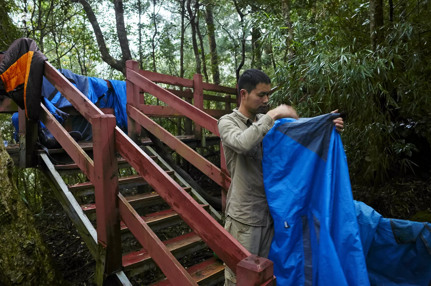 ▲在下撤到海拔1000米的平臺遇見了這個小伙子,上山的時候我就看到這里堆放的帳篷,還在納悶:難道這里還有露營者?原來這些帳篷都是這個小伙子和其他幾位驢友的,他是剛從五指山最高峰“二指”登頂后下撤到這里整理帳篷的。這位來自廣州的小伙子和幾位小伙伴是專程到五指山登頂?shù)?,他們攜帶登山露營裝備,前一天下午就到了五指山,當時是準備登頂?shù)?,但由于天氣原因放棄登頂,當晚他們就在這個地點安營扎寨。今天早上凌晨5:30他們把帳篷就放在這里,攜帶必要的物品,開始向海拔1867米的“二指”登頂。小伙子告訴我,登頂?shù)穆泛茈y走,有的地方只有獨木支撐,有的地方是垂直的山崖,靠崖邊的鐵索才能向上攀登,五指山他來過幾次了,但這次還是花了1個多小時才登到了頂峰。小伙子一邊整理著裝備,一邊自豪的告訴我,盡管攀登幸苦,不過運氣很好,清晨7:10,他在“二指”最高峰上看到了晨曦中的五指山云海,非常壯觀,我也觀看了他手機拍攝的五指山云海視頻,確實震撼。告別了小伙子,內(nèi)心還是挺矛盾的,一方面見到了征服二指峰的驢友和震撼的圖片,一方面又為我們沒有最后登頂?shù)轿逯干阶罡叻宥械竭z憾,哎,旅行、徒步、登山和攝影也許永遠都是一個遺憾的旅程和藝術,這些遺憾和不完美也為下一次的重返提供一個最好的理由。