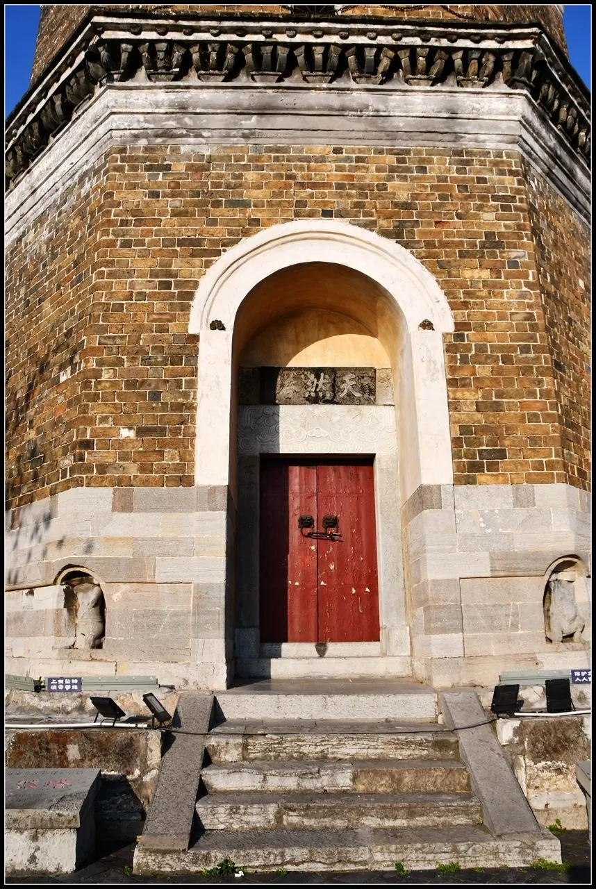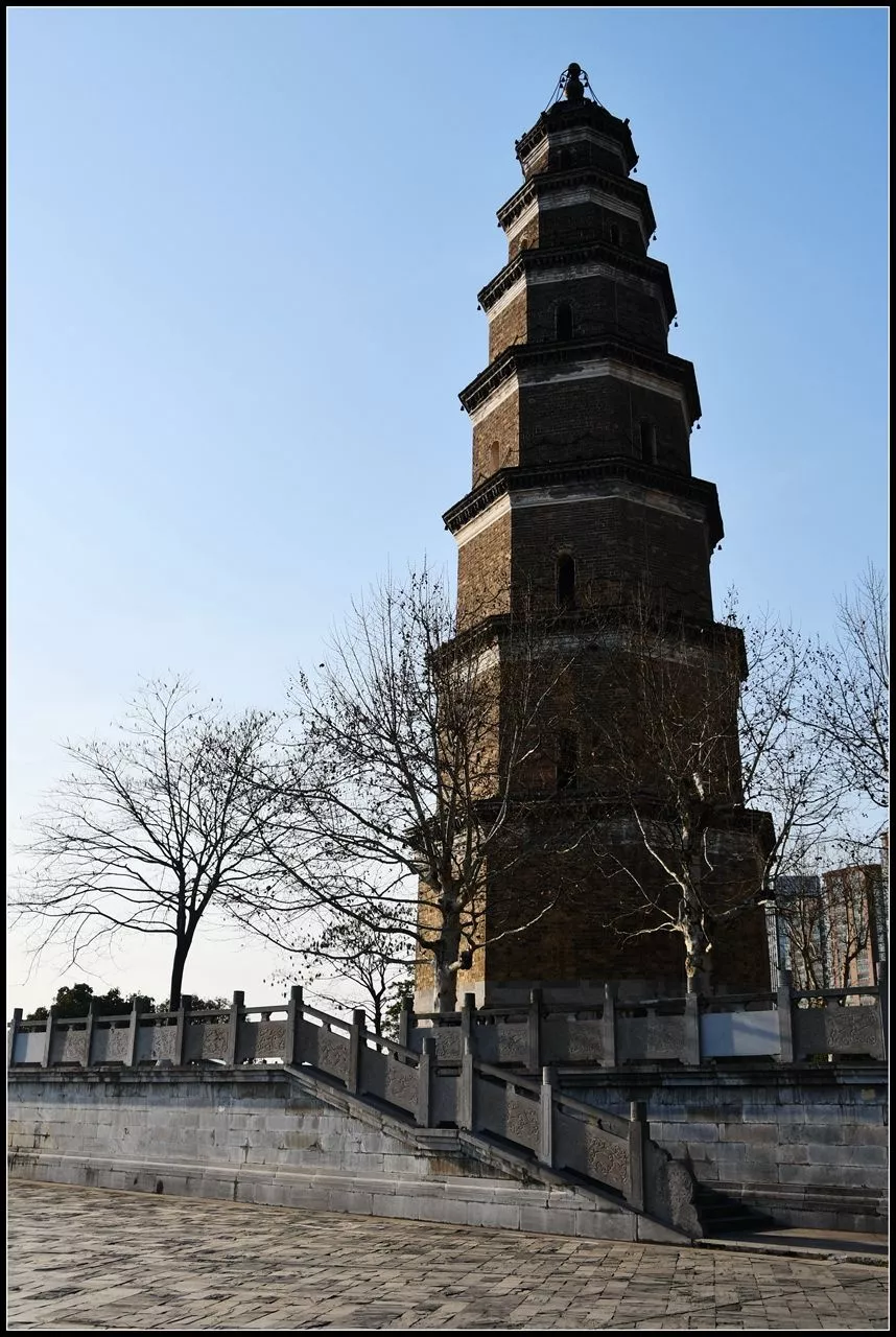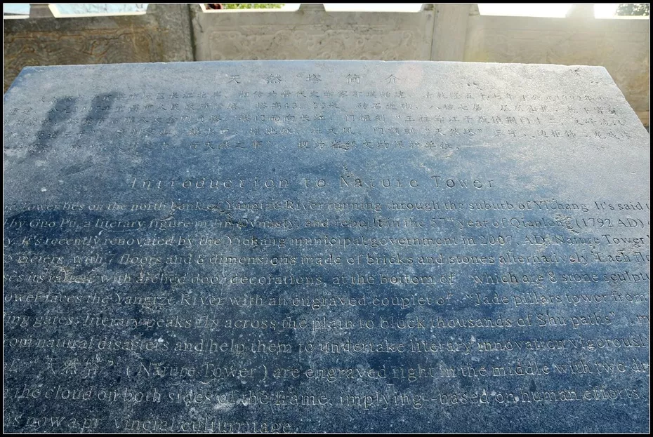 天然塔位于湖北省宜昌城東長(zhǎng)江北岸,據(jù)1999年版的《宜昌市志·文化·文物》載:“天然塔位于宜昌城東南長(zhǎng)江北岸,相傳為晉代郭璞僑居夷陵時(shí)所建,明廢。”我們現(xiàn)在看到的天然塔清乾隆五十七年(1792年)重修。磚石疊砌,八棱七層,高約42米,層層出檐,其下皆有斗拱裝飾。塔座八角,有石雕八大金剛負(fù)塔,形象生動(dòng)。底層塔門西向大江,石額刻“天然塔”三字,邊框飾二龍戲珠及云紋圖案;門楹刻:“玉柱聳江干,巍鎮(zhèn)荊門十二;文峰凌漢表,雄當(dāng)蜀道三千?!彼?nèi)有145級(jí)石梯盤旋至頂。
