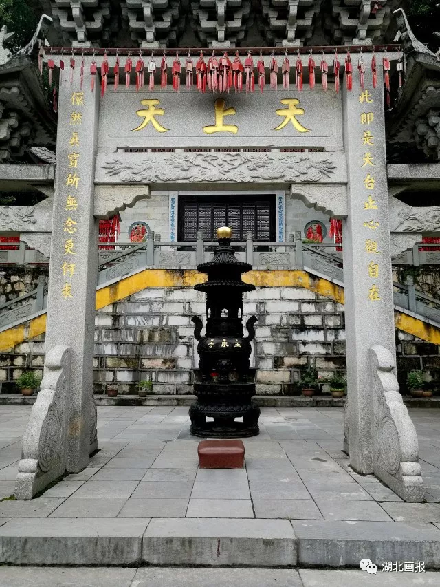 簡單的介紹一下其中的天王殿,天王殿是中軸線上的第一座建筑,坐西朝東,門前有寬闊的廣場。面闊七間,進深三間,除了高大的中門外,在盡間各開一園門,南盡間作票房。粉墻高5米;屋面為單檐硬山灰筒瓦頂,正脊的云龍拼版和吞脊大吻,全部是灰陶制品。殿內梁架為木結構穿斗式,是鄂西地方民居的一般做法。殿內造像全為現(xiàn)代重塑。明間正面本尊,是彌勒化身的布袋和尚坐像,漢白玉石料。彌勒佛背后,雕塑手執(zhí)寶杵,現(xiàn)天將軍身的韋馱天像,全身金盔金甲,左手握杵拄地,右手插腰,左足略向前立,面向大雄寶殿。在天王殿南北梢間,塑四大天王像。天王殿始建時間不詳,自明代以來經(jīng)過多次重修。