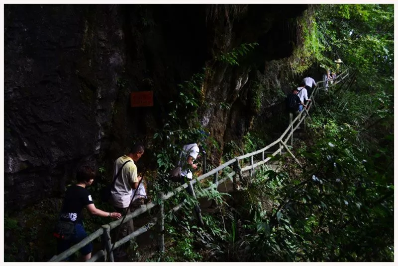 開陽(yáng)猴耳天坑位于貴陽(yáng)市開陽(yáng)縣。天坑坑口直徑300米,坑身280米,坑底最大直徑也是280米,由于形狀像猴耳,故名為“猴耳”天坑。天坑在地理地貌上為喀斯特漏斗,是地殼運(yùn)動(dòng)的產(chǎn)物,再加上上千萬(wàn)年的雨水溶蝕沖刷,地下水系又長(zhǎng)時(shí)間對(duì)巖層不斷侵蝕搬運(yùn),最終形成了巨大的地下穴洞?!昂锒碧炜釉贾脖槐Wo(hù)較為完好,多處溶洞暗河穿插其間,形成尋回曲折的通道,被當(dāng)?shù)厝朔Q之為“一線天”或“閃電門”的奇觀就于天坑中的大片竹林相連。這里一年四季氣候溫潤(rùn)如春、山花斗艷、百鳥爭(zhēng)鳴,又為這片圣地平添了一種安靜、祥和、自然的神奇色彩。