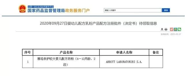 9月27日,國家藥品監(jiān)督管理局政務(wù)服務(wù)門戶公布了1批次嬰幼兒配方乳粉產(chǎn)品配方注冊批件(決定書)待領(lǐng)取信息。信息包括雅培親護(hù)1款嬰幼兒配方奶粉。