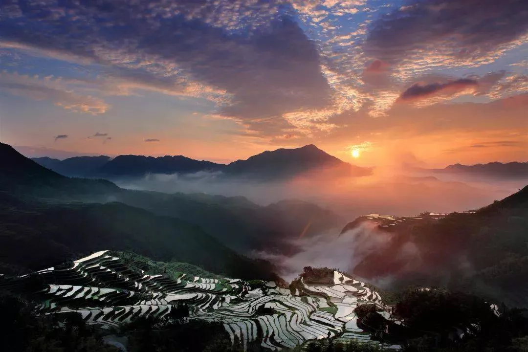 沿著崎嶇蜿蜒的山路,只要追著云海流動(dòng)的方向,就能抵達(dá)這里,考坑古村被群山簇?fù)碇?,在山頭回看,它就坐落在山底中央。