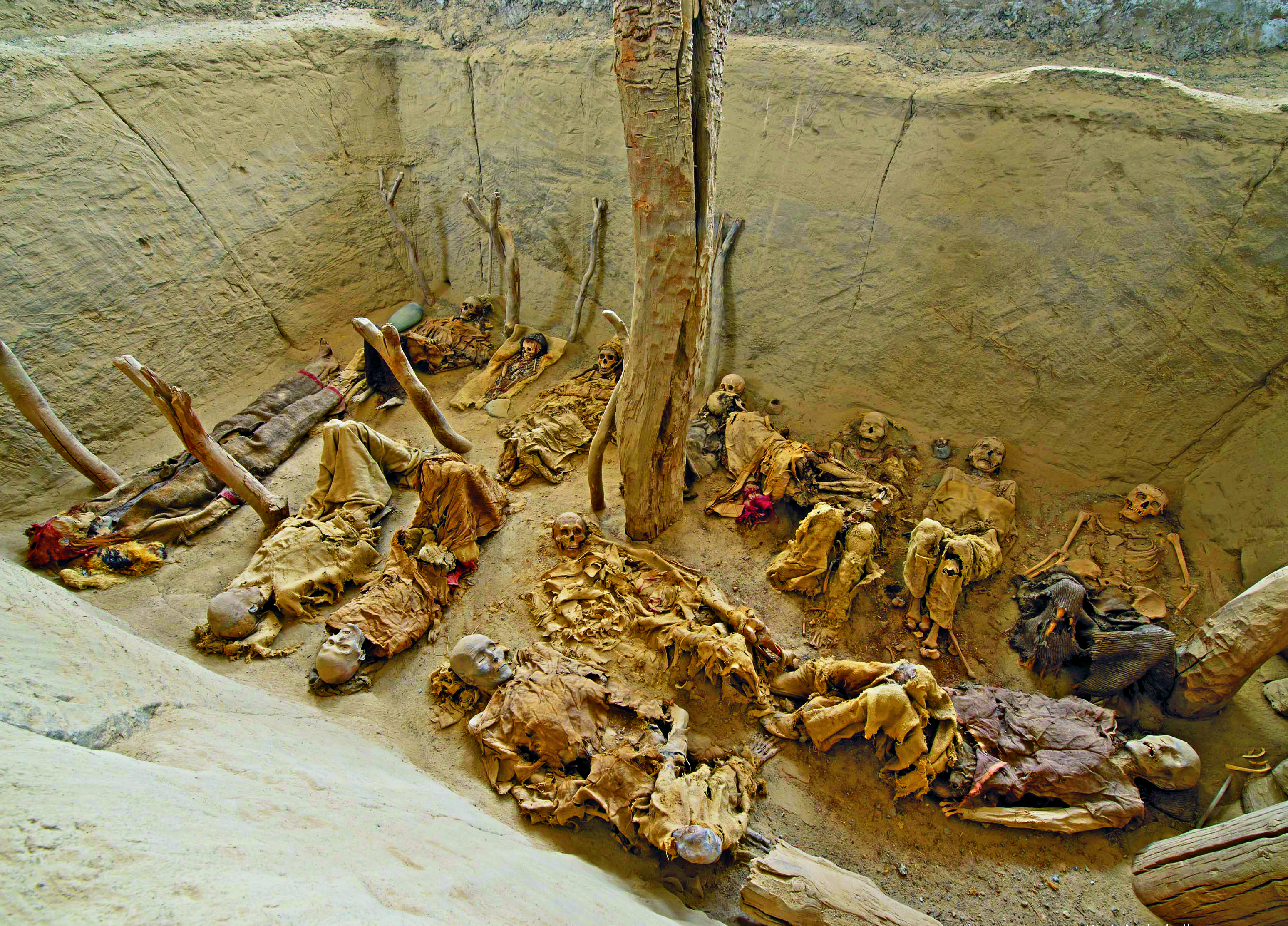 1996年出土的24號(hào)墓葬位于扎滾魯克古墓群的西南區(qū),為單墓道長(zhǎng)方形棚架墓,墓室用鹽堿水處理,硬度極大,墓室內(nèi)的干尸干化程度很好,保存非常完整,有很高的文物考古研究和觀賞價(jià)值。墓向東北方,墓口為二層臺(tái)式,屬家庭叢葬墓,共有男、女、小孩14人,以仰身屈肢葬為主。隨葬有石、陶、木、銅、鐵、棉、毛服飾等,年代距今約2600年(春秋戰(zhàn)國(guó))。