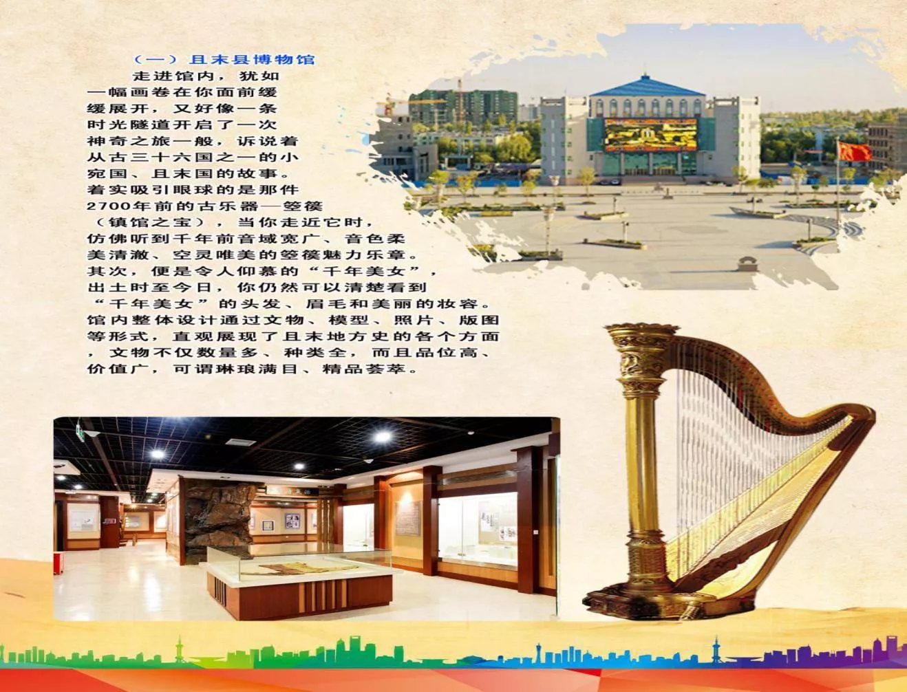 且末縣博物館:坐落在且末縣埃塔路西側(cè)、育巷北側(cè)中段,與且末縣黨政大樓南北呼應(yīng)。且末縣博物館初建于2008年,于2009年正式開館,建筑總面積達(dá)到1800平方米,展廳面積1200平方米。博物館主題為“古國(guó)神韻”——且末自然與人文遺產(chǎn)陳列, 全館共分為9個(gè)展區(qū),通過文物、模型、照片、沙盤、版圖等形式,客觀地展示了且末地方史和且末經(jīng)濟(jì)社會(huì)文化生活的各個(gè)方面。