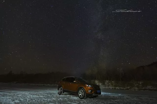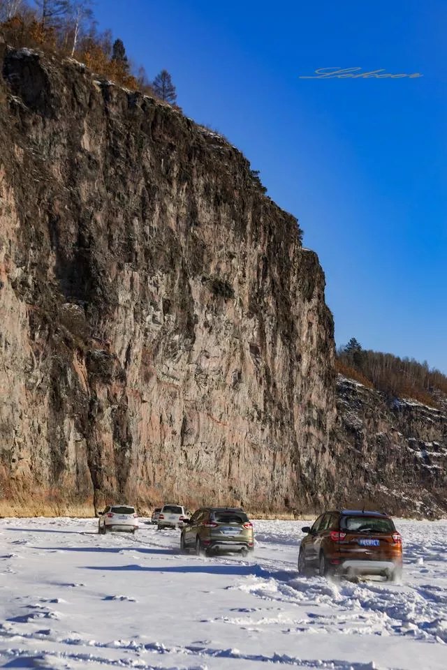 在黑龍江面玩的差不多了,我們驅(qū)車去看傳說中的呼瑪河冰瀑——冰封河面,萬丈絕壁,冰瀑奇觀畫風(fēng)融入一體時,游人無論凹什么造型,頂天了,也是“到此一游”,最多發(fā)發(fā)朋友圈得瑟一下??墒牵瑯訄鼍巴瑯游恢?,如果是輛車,這畫風(fēng)很可能就是封面——除了冬季,這樣的場景,你想都別想!而這樣的場景,除了我們的導(dǎo)演,估計也成絕版,有誰能像我們這樣貪玩,把車開到?jīng)]有人煙的呼瑪河心里去呢?